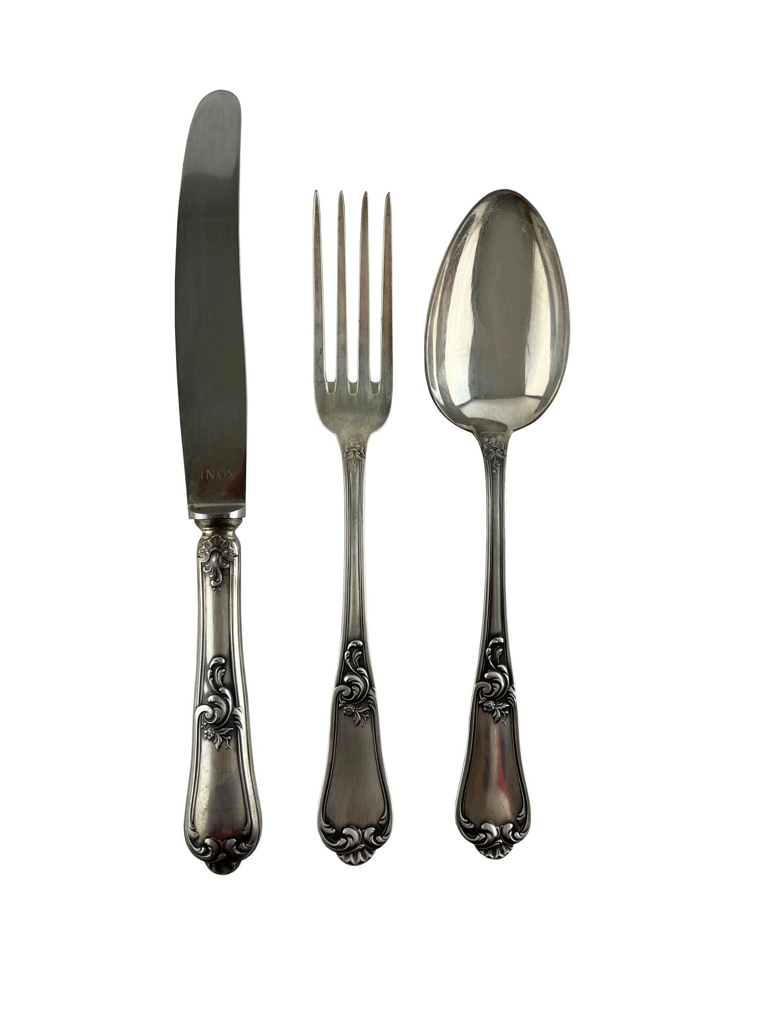 Juego de cubiertos alemán en plata Bruckmann 925 estilo Luis XV. Compuesto por: