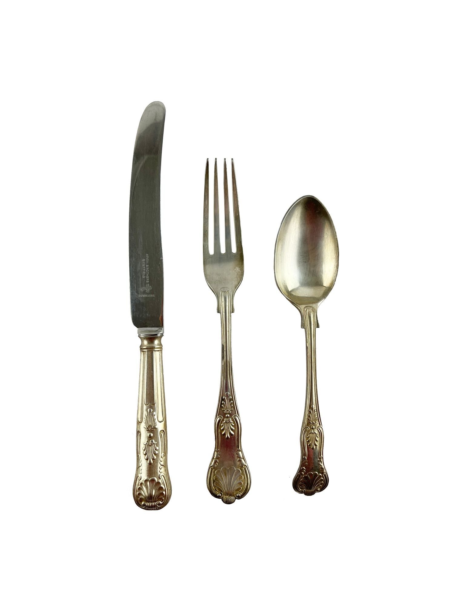 Juego de cubiertos inglés en metal plateado. Compuesto por: