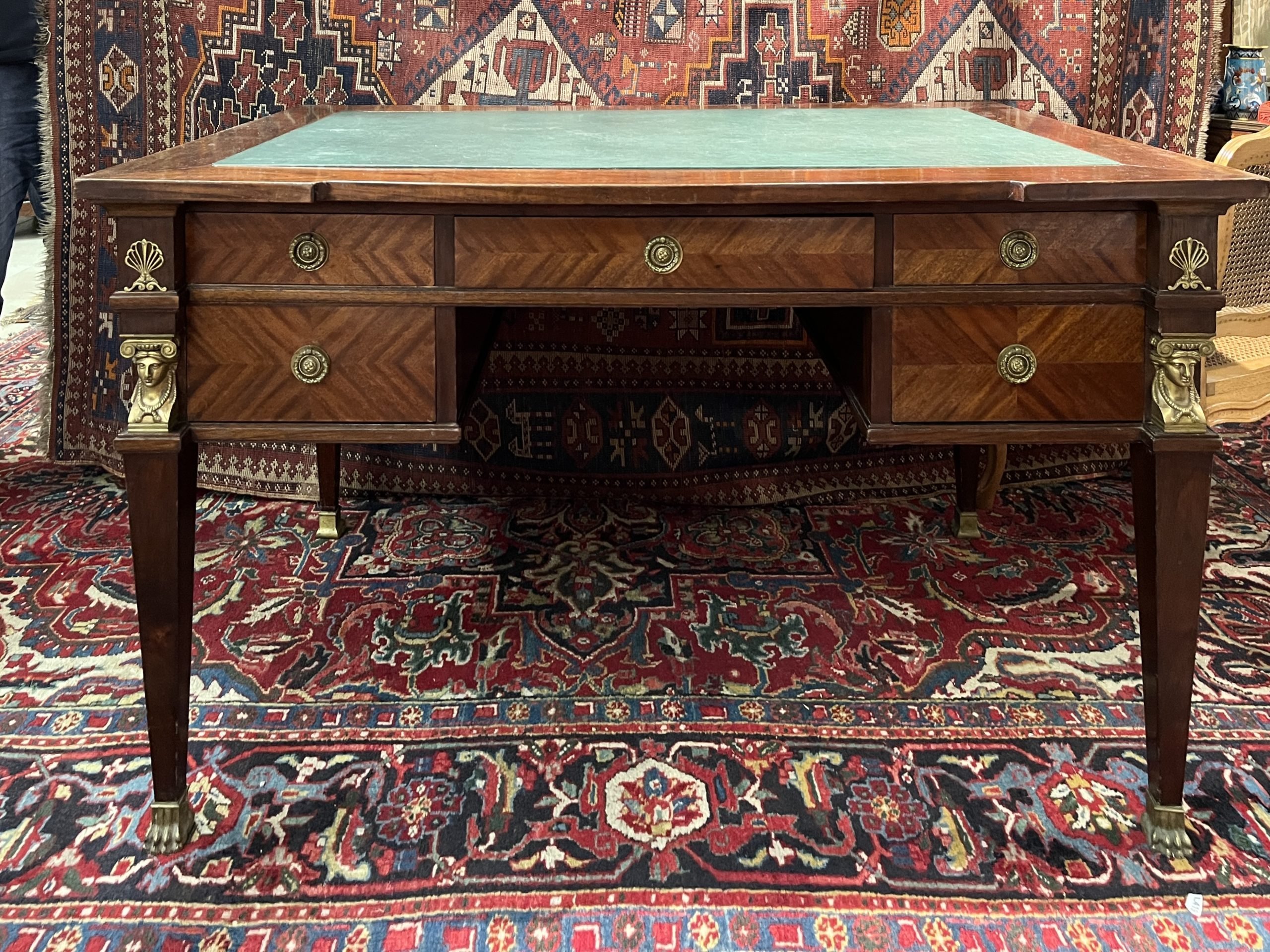 Juego de escritorio y sillón estilo Imperio en cedro, con aplicaciones en bronce esculturadas «cariátides» y regatones esculturados «garras». Escritorio de cinco cajones con tiradores de bronce y tapa forrada en cuero verde. 80 x 131 x 83 cm. Sillón medio punto con asiento tapizado en cuero verde.
