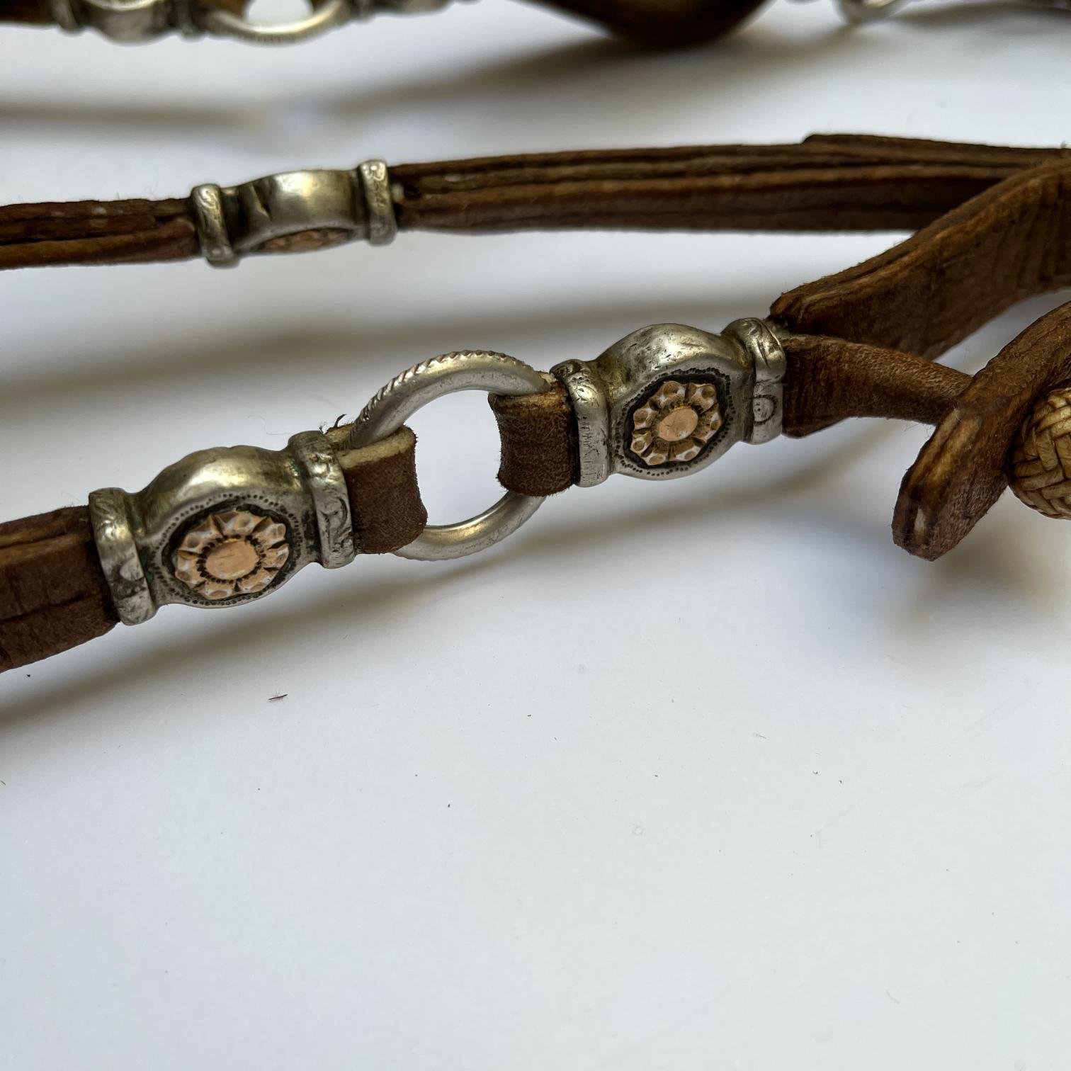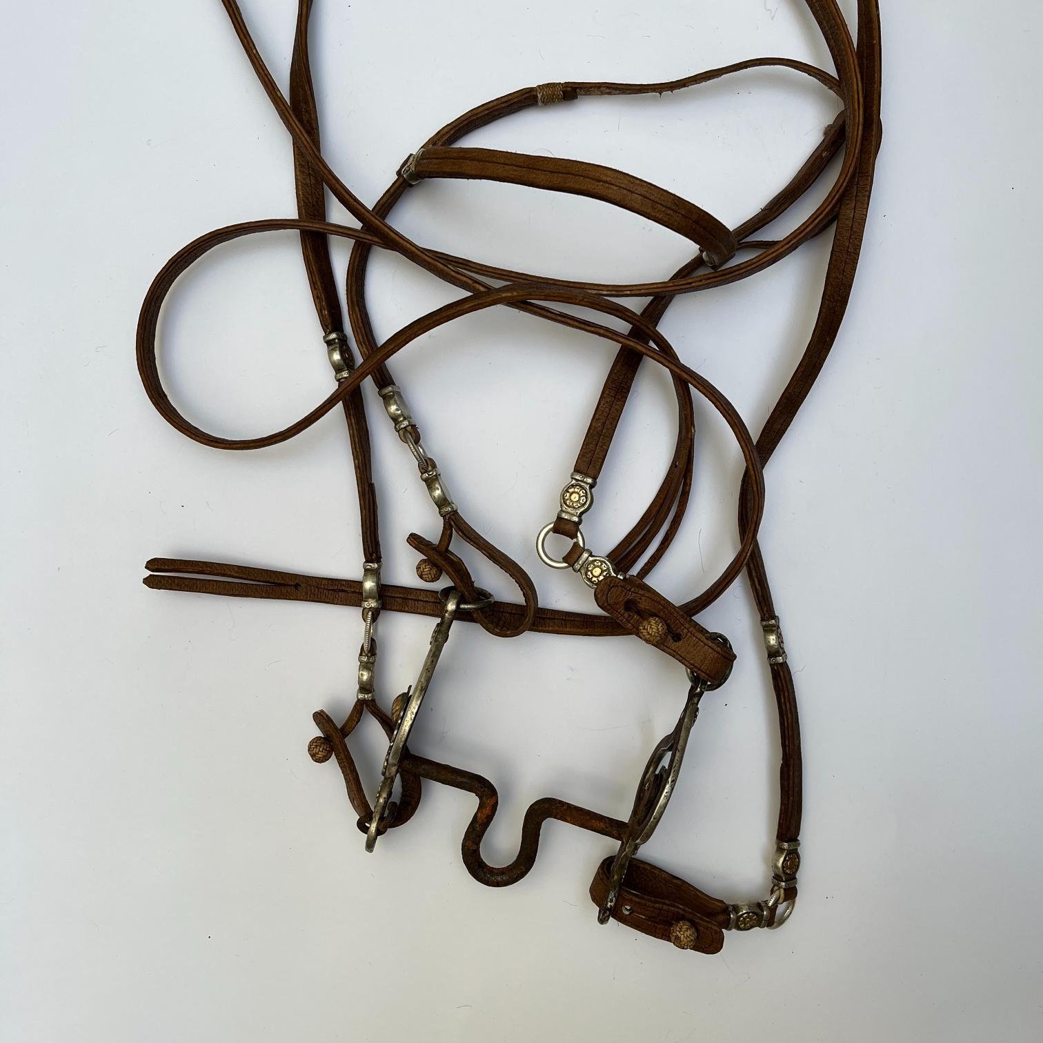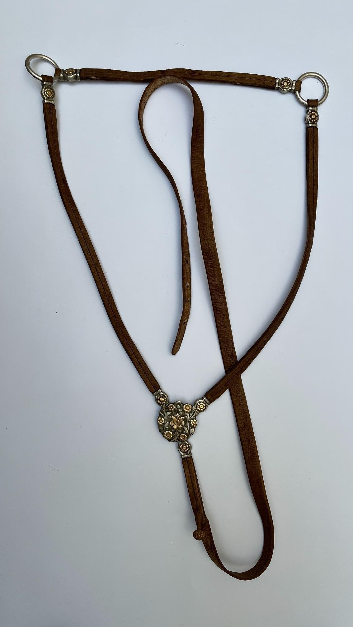 Juego de freno completo y pechera, realizados en cuero crudo con botones en fino cuero trenzado, diecinueve pasadores chatos en plata y oro cincelados «flores», argollas en metal con borde estriado y medallón central de pechera cincelado «hojas y flores». Freno en hierro forjado, con patas forradas en plata y oro cinceladas «hojas y flores». Cuero en perfecto estado.