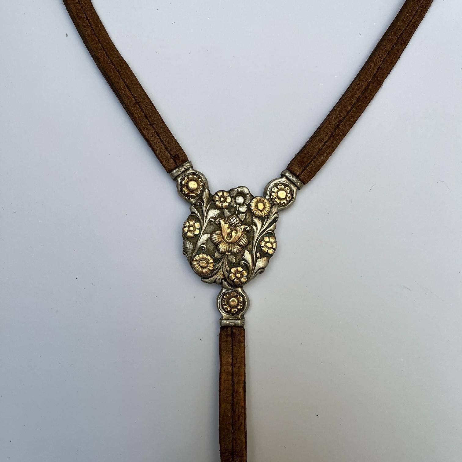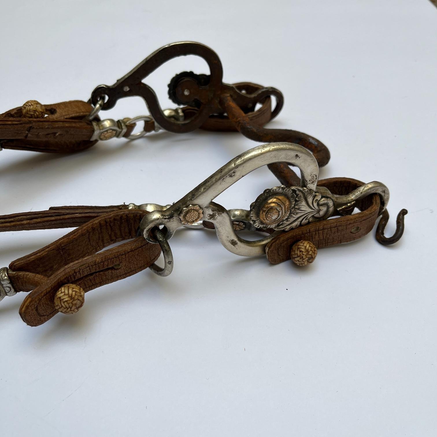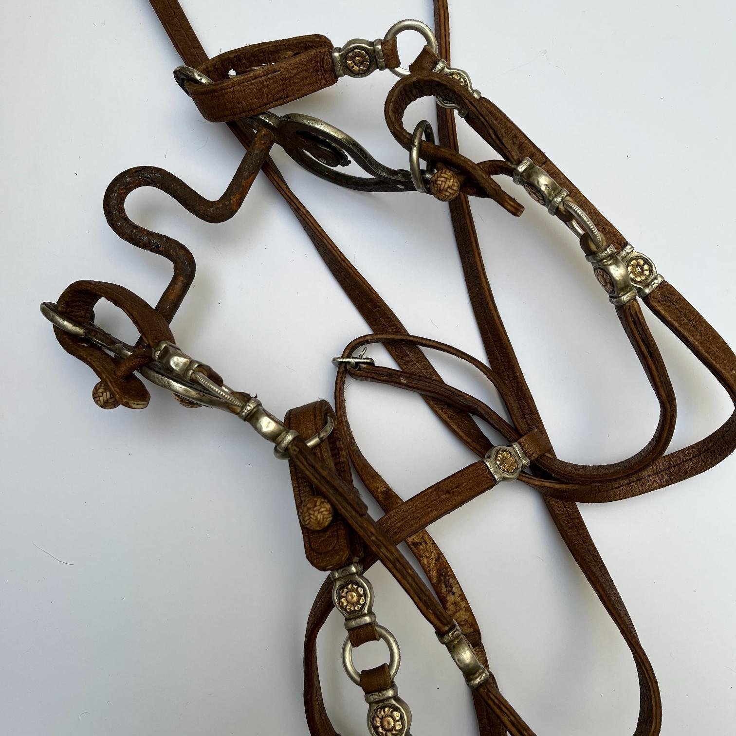 Juego de freno completo y pechera, realizados en cuero crudo con botones en fino cuero trenzado, diecinueve pasadores chatos en plata y oro cincelados «flores», argollas en metal con borde estriado y medallón central de pechera cincelado «hojas y flores». Freno en hierro forjado, con patas forradas en plata y oro cinceladas «hojas y flores». Cuero en perfecto estado.