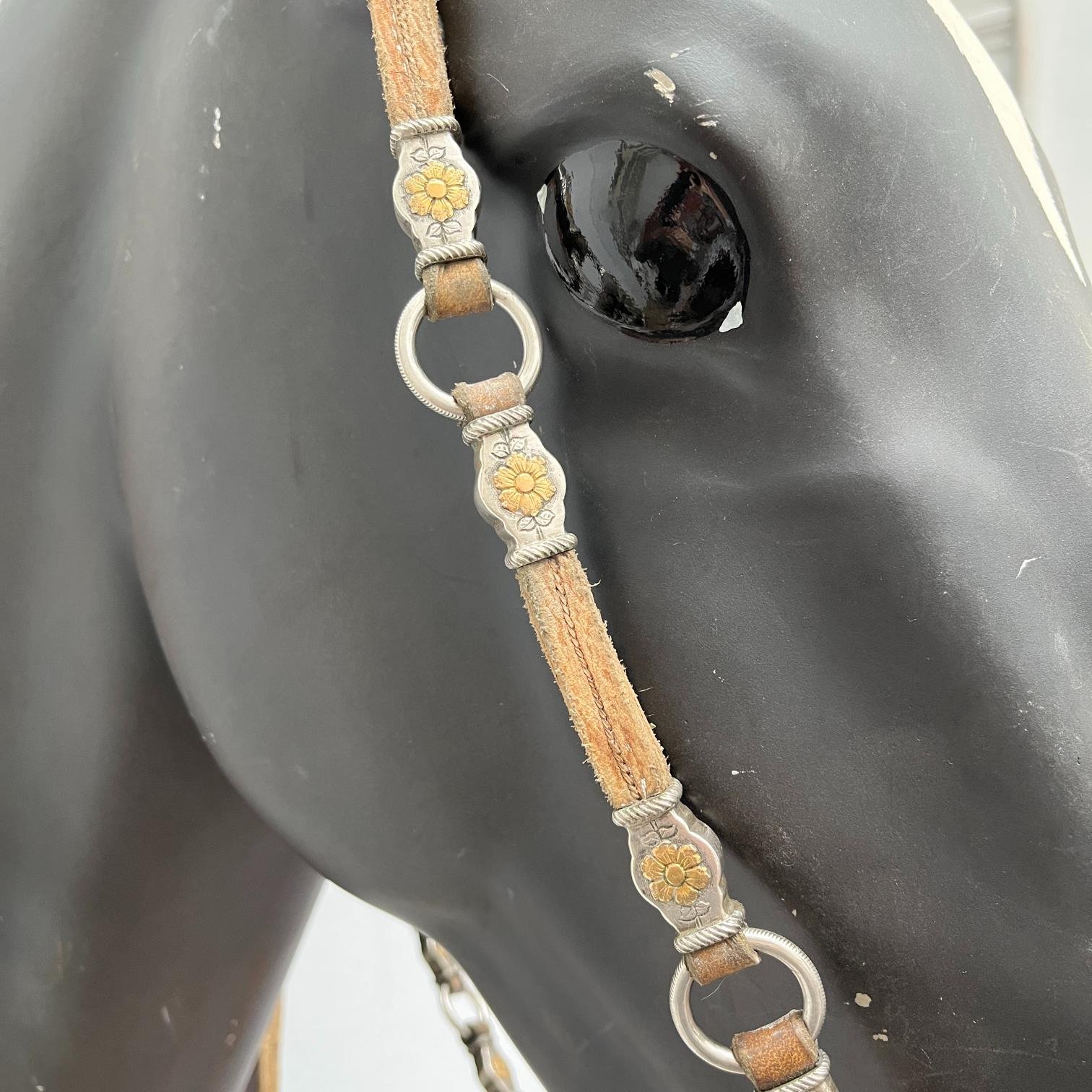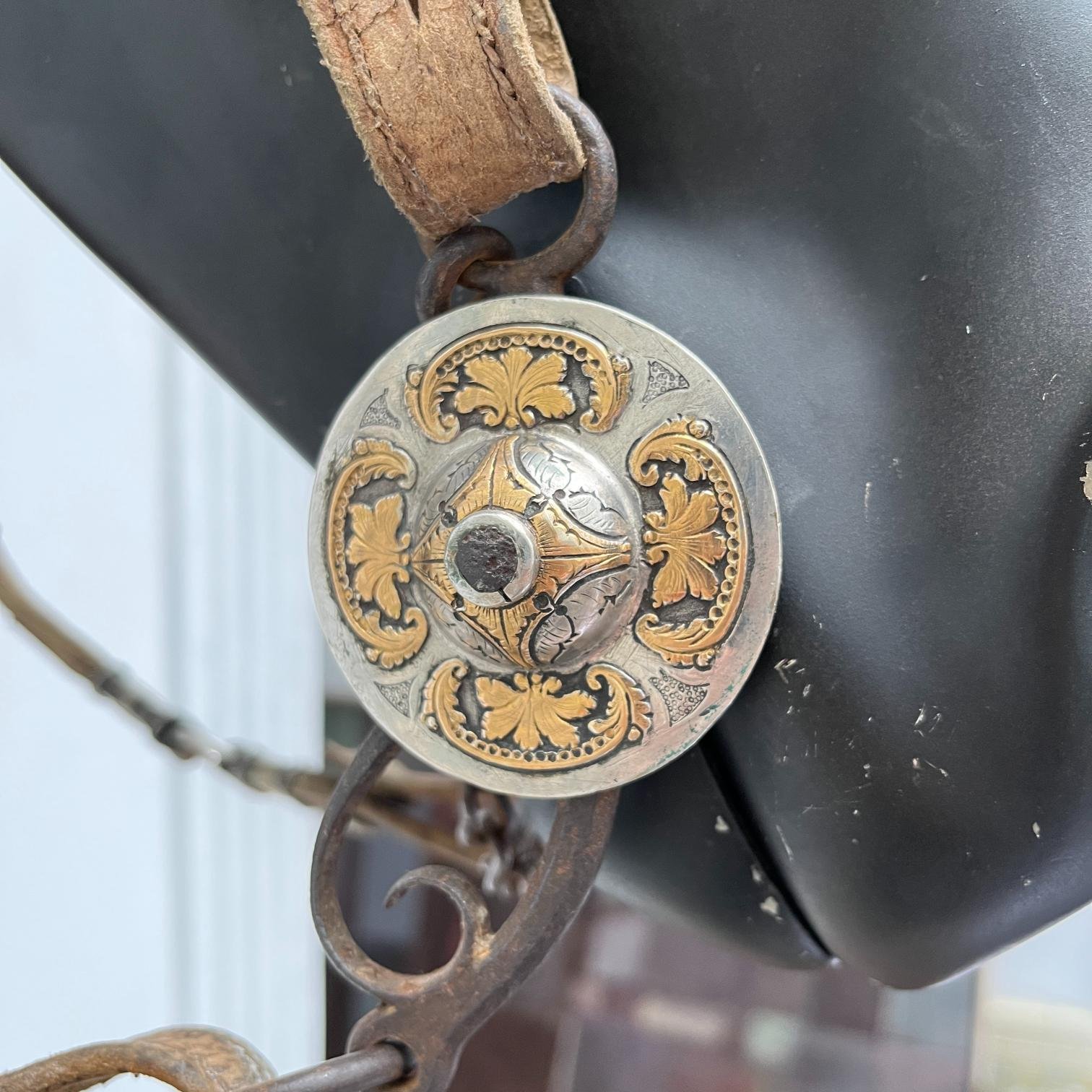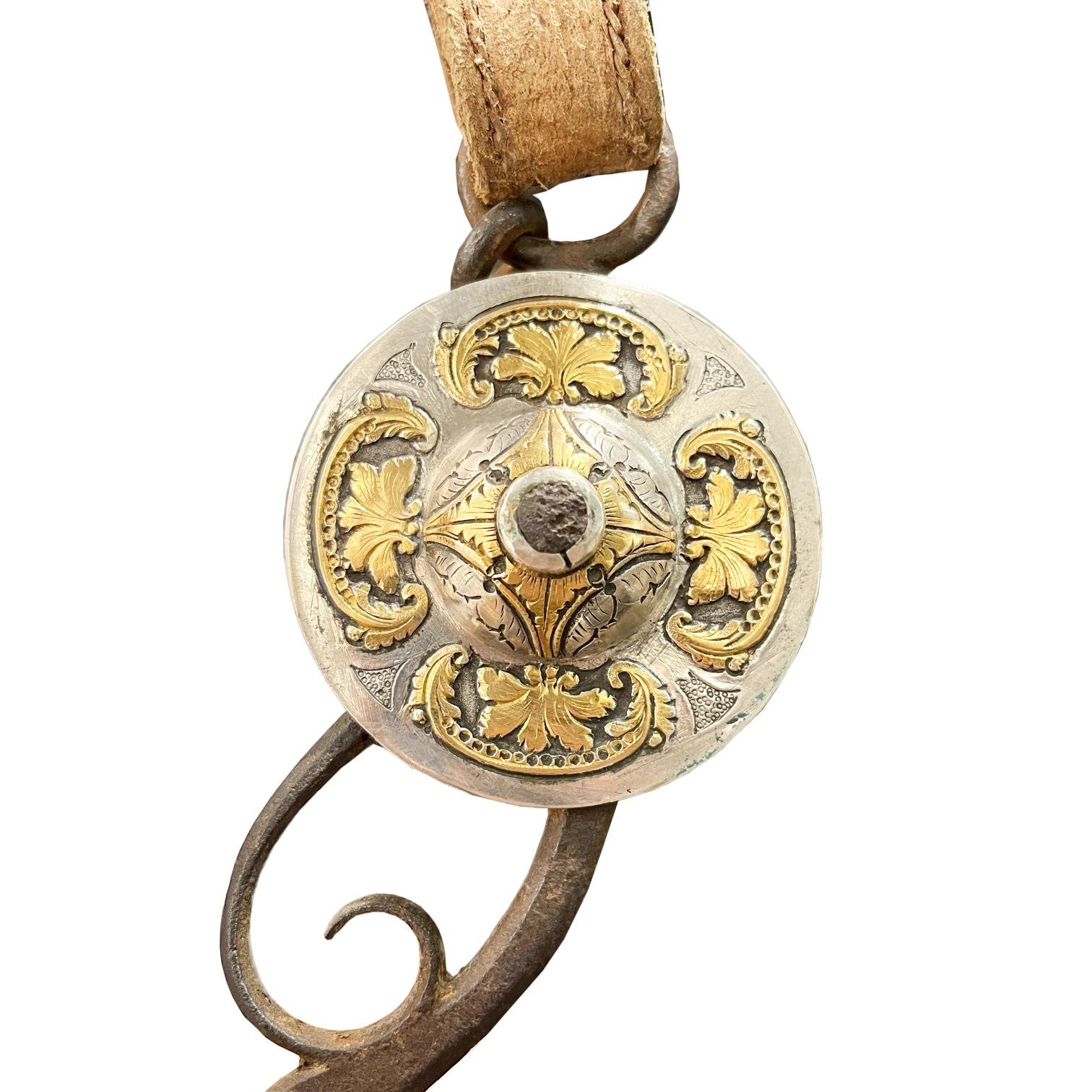 Juego de freno, con cabezada y riendas, completo. Compuesto por: freno en hierro forjado, con copas en plata y oro cincelados «hojas y flores», de un diámetro de 6 mm; cabezada y par de riendas en cuero crudo, con cuarenta y un pasadores (veinticinco en doble faz y dieciséis en una faz), cuatro botones cincelados «flor» y diecisiete argollas en plata estriada.