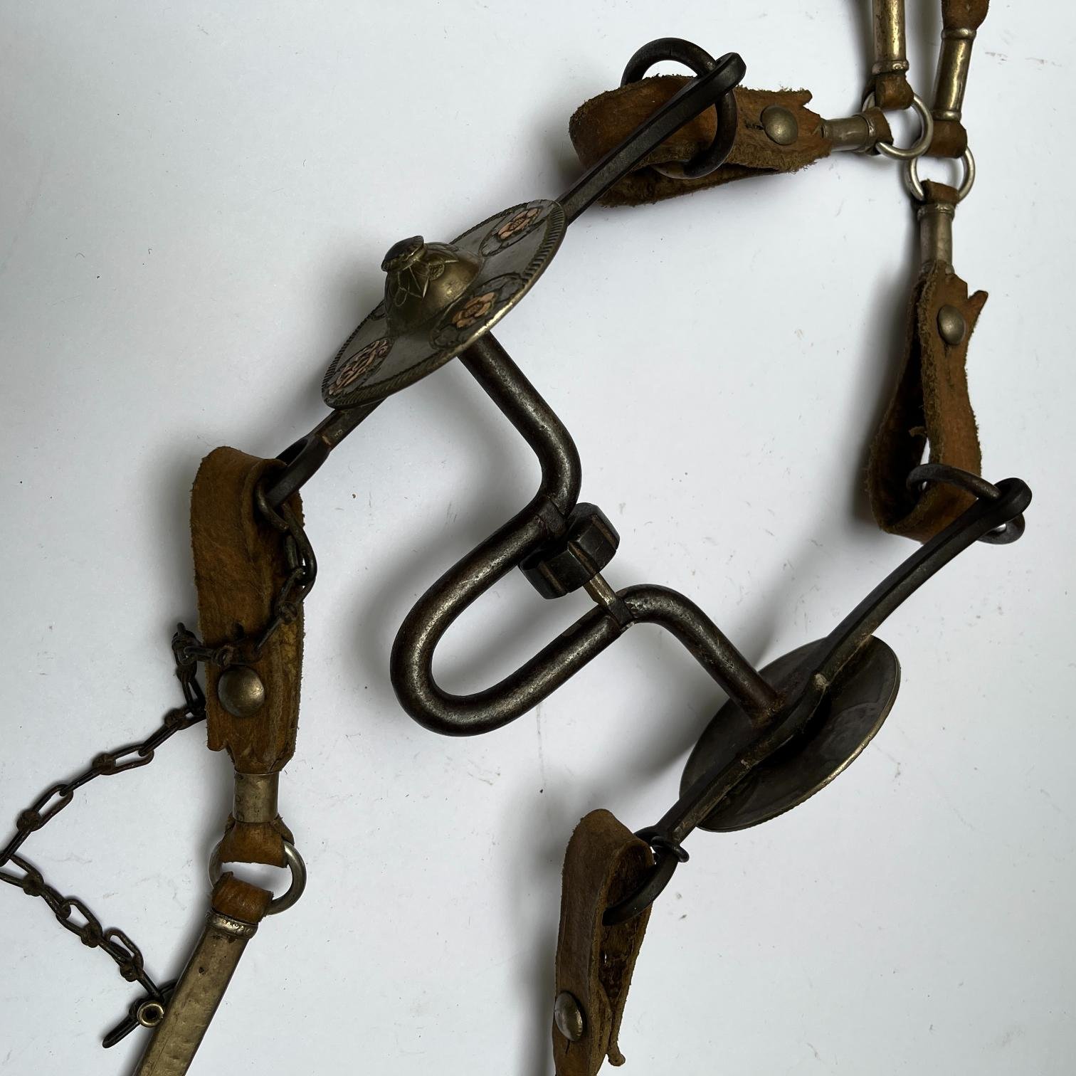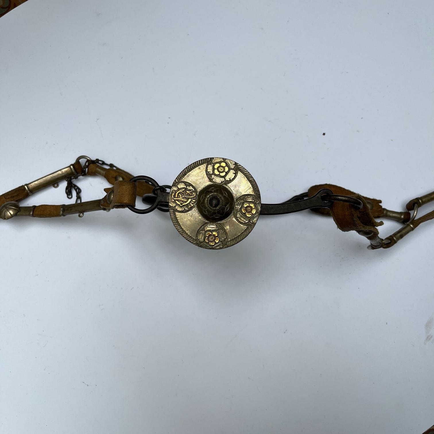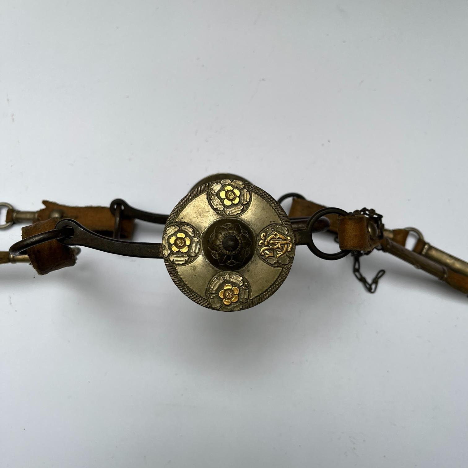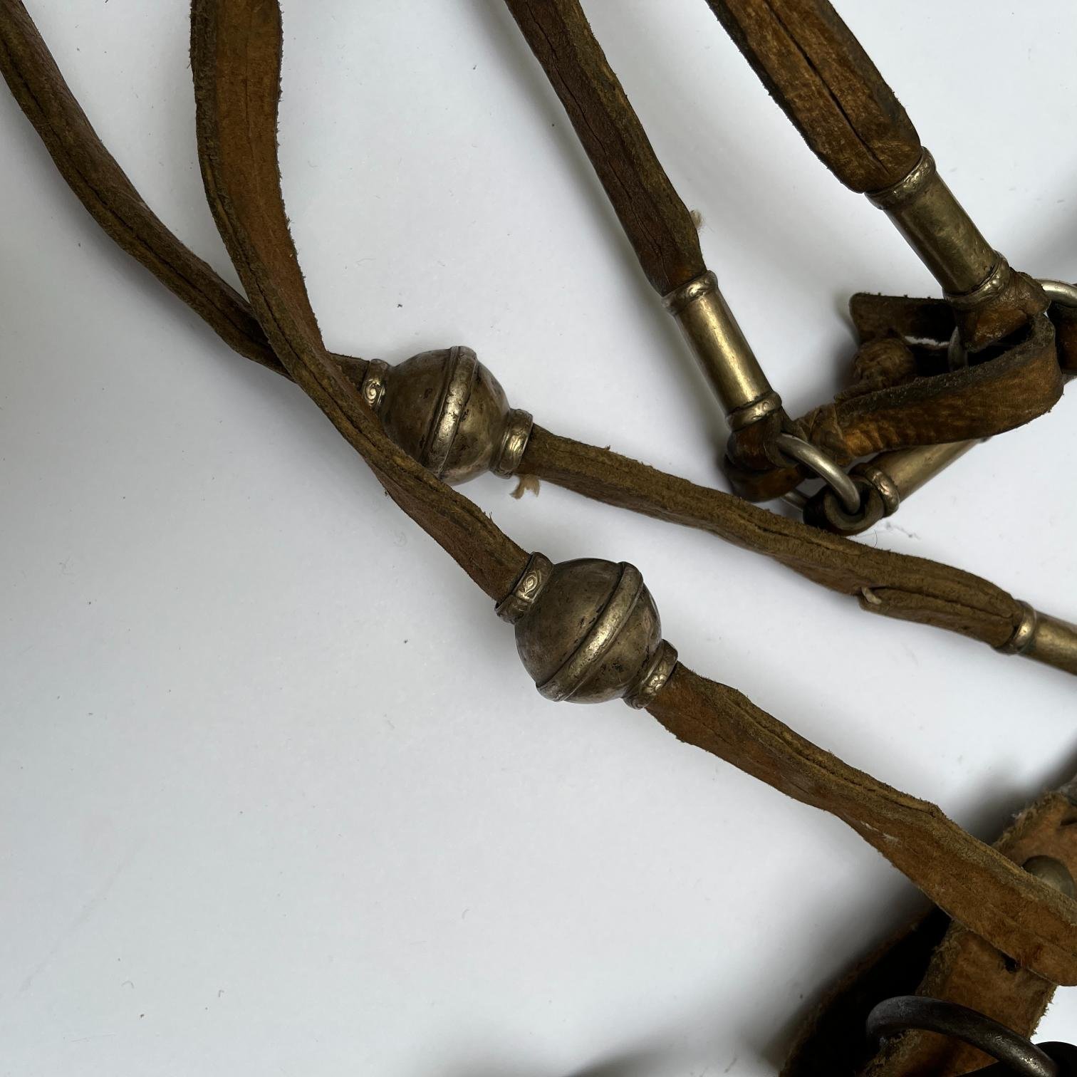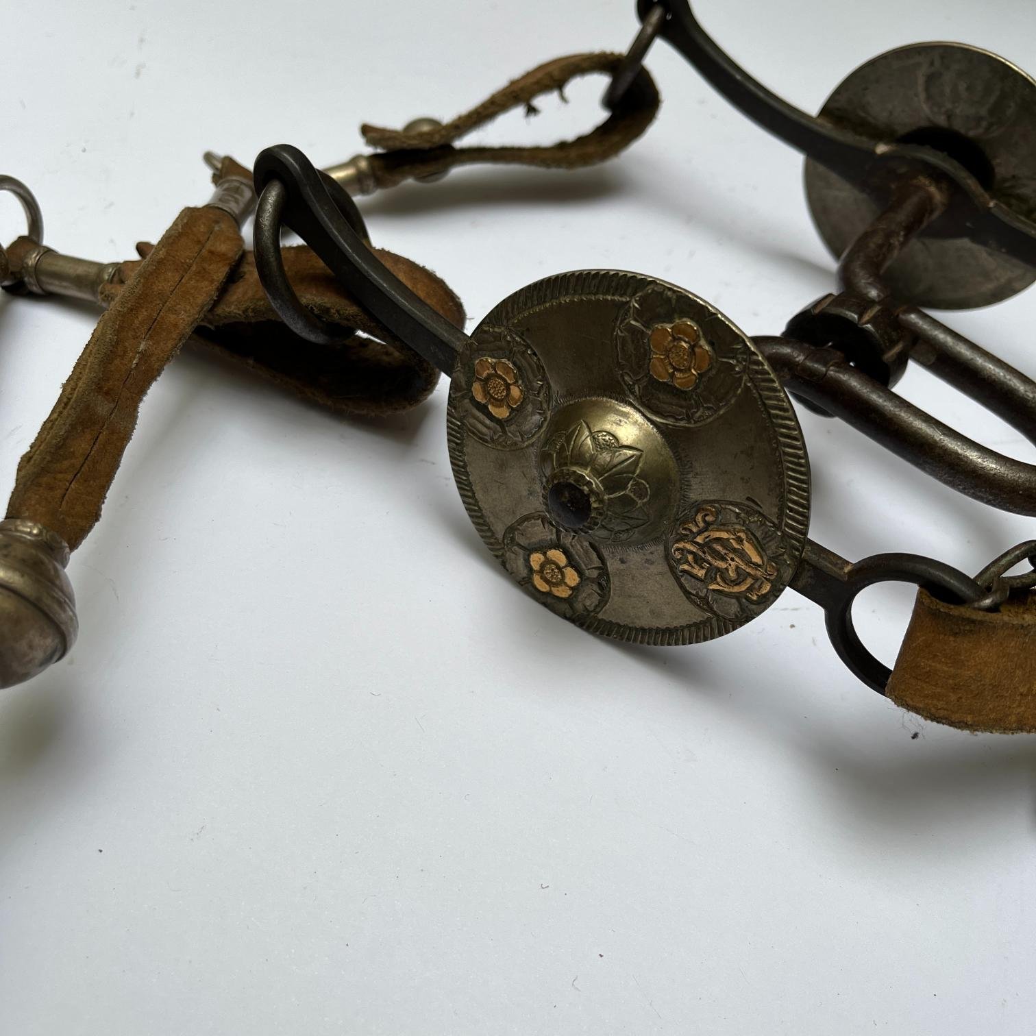 Juego de freno completo. Compuesto por: freno en hierro forjado, con copas en plata y oro cinceladas «hojas y flores» (de un diámetro de 7,5 cm), grabadas con iniciales «R.G.»; cabezada y par de riendas en cuero crudo (riendas con catorce pasadores cilíndricos en plata lisa y cuatro bombas); cabezada con seis pasadores chatos en plata lisa (dos de ellos esculturados «flor») y seis pequeños pasadores.