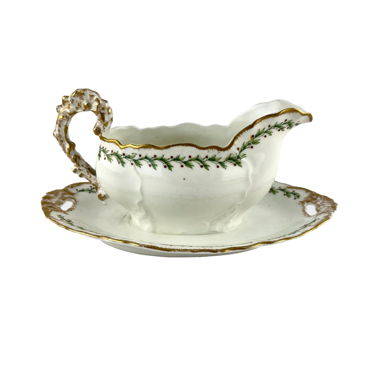 Juego francés de doce platos y una salsera en porcelana Limoges, con borde en ondas, decoración floral y detalles en oro.