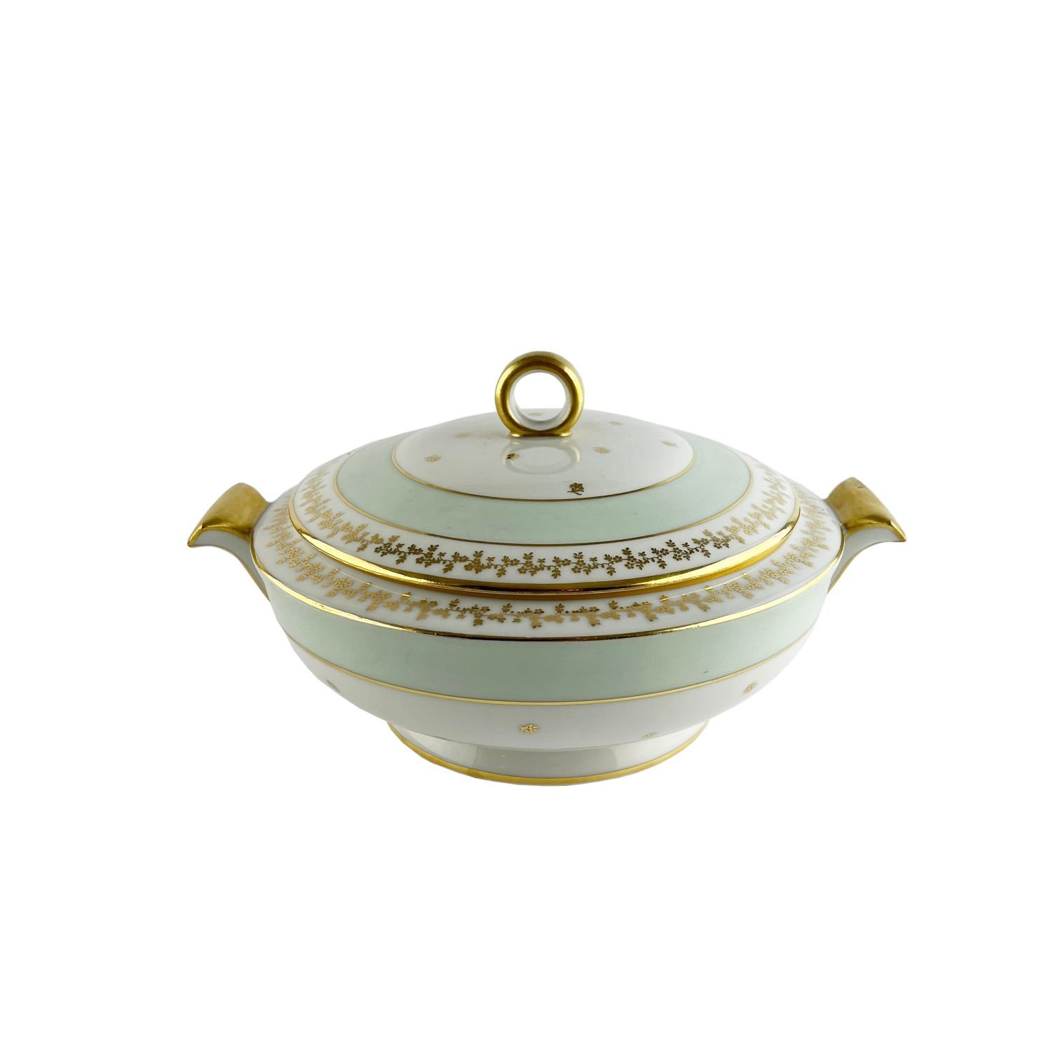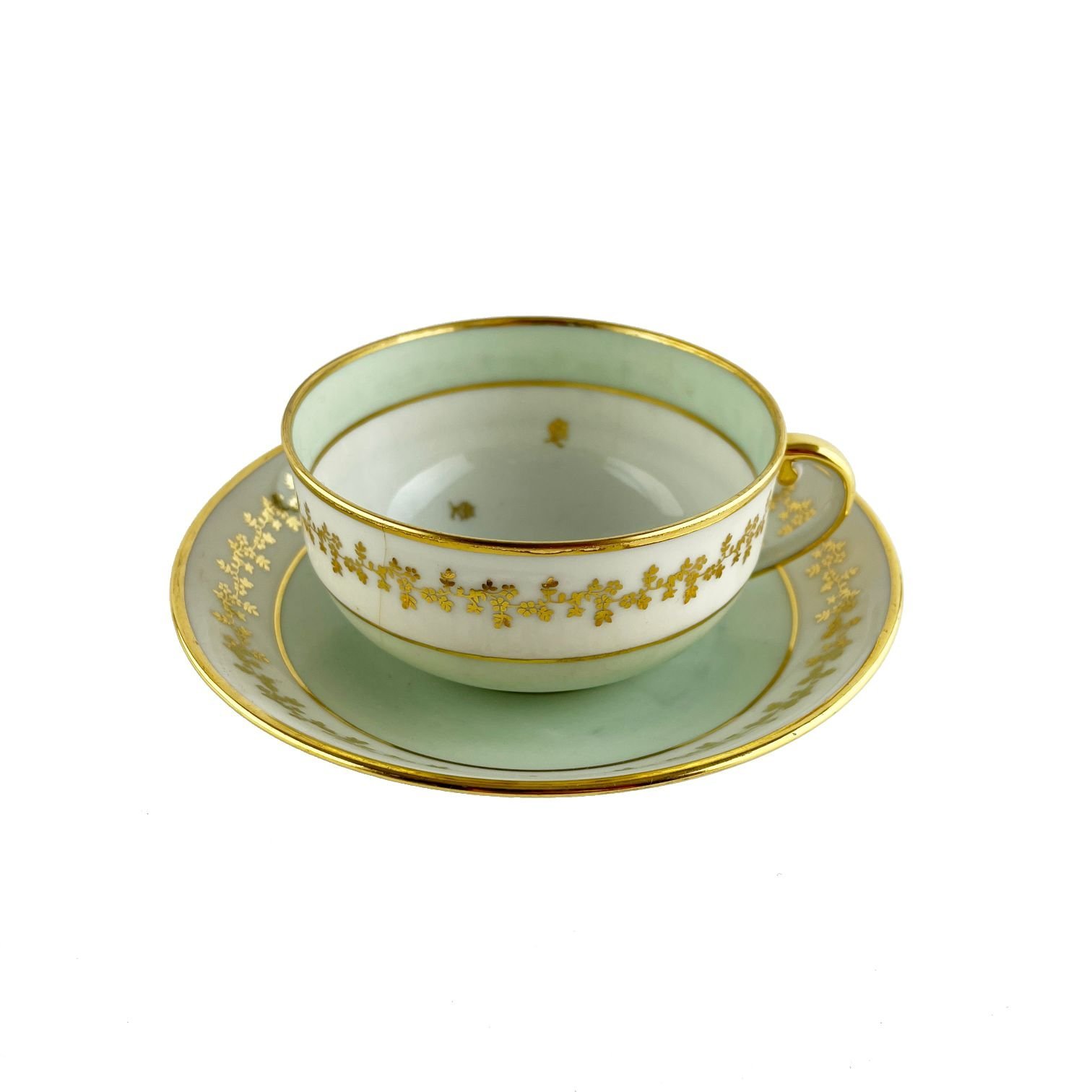 Juego de mesa francés en porcelana Limoges decorado «flores» con guarda en verde y dorado. Compuesto por: