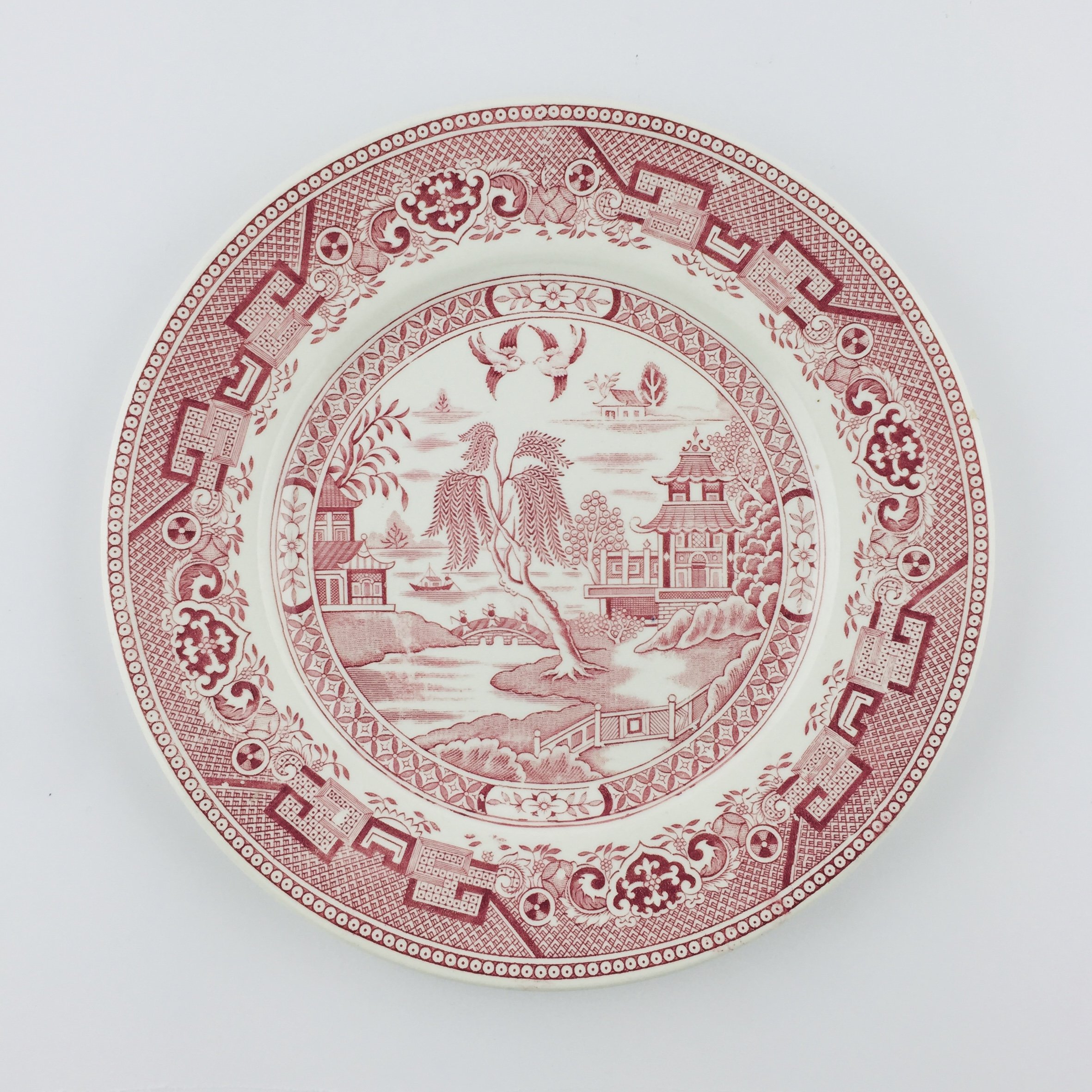 Juego de mesa en loza Lozur, decorado tipo Willow en bordeaux. Compuesto por: