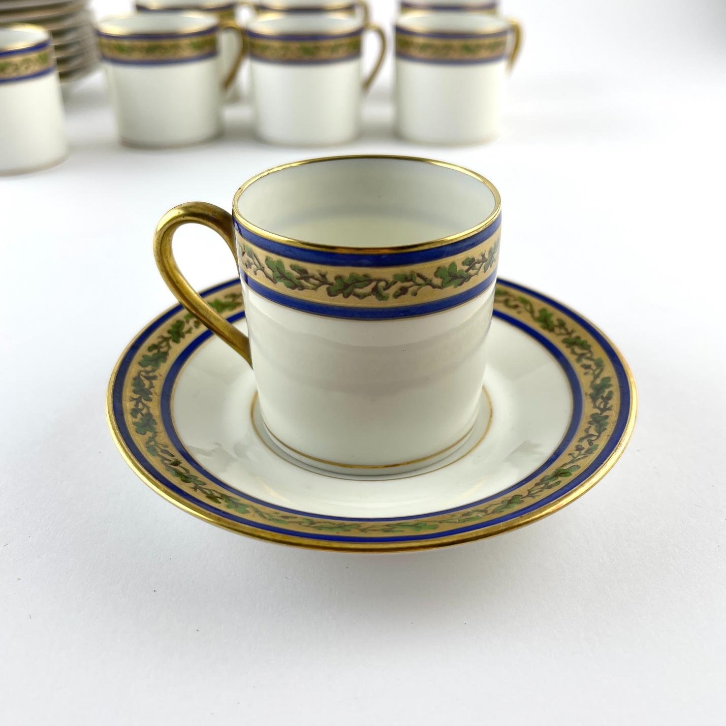 Juego de ocho pocillos para café en porcelana Charles Arenfeldt de Limoges color blanco con guarda floral en dorado y azul. Con sus platillos.