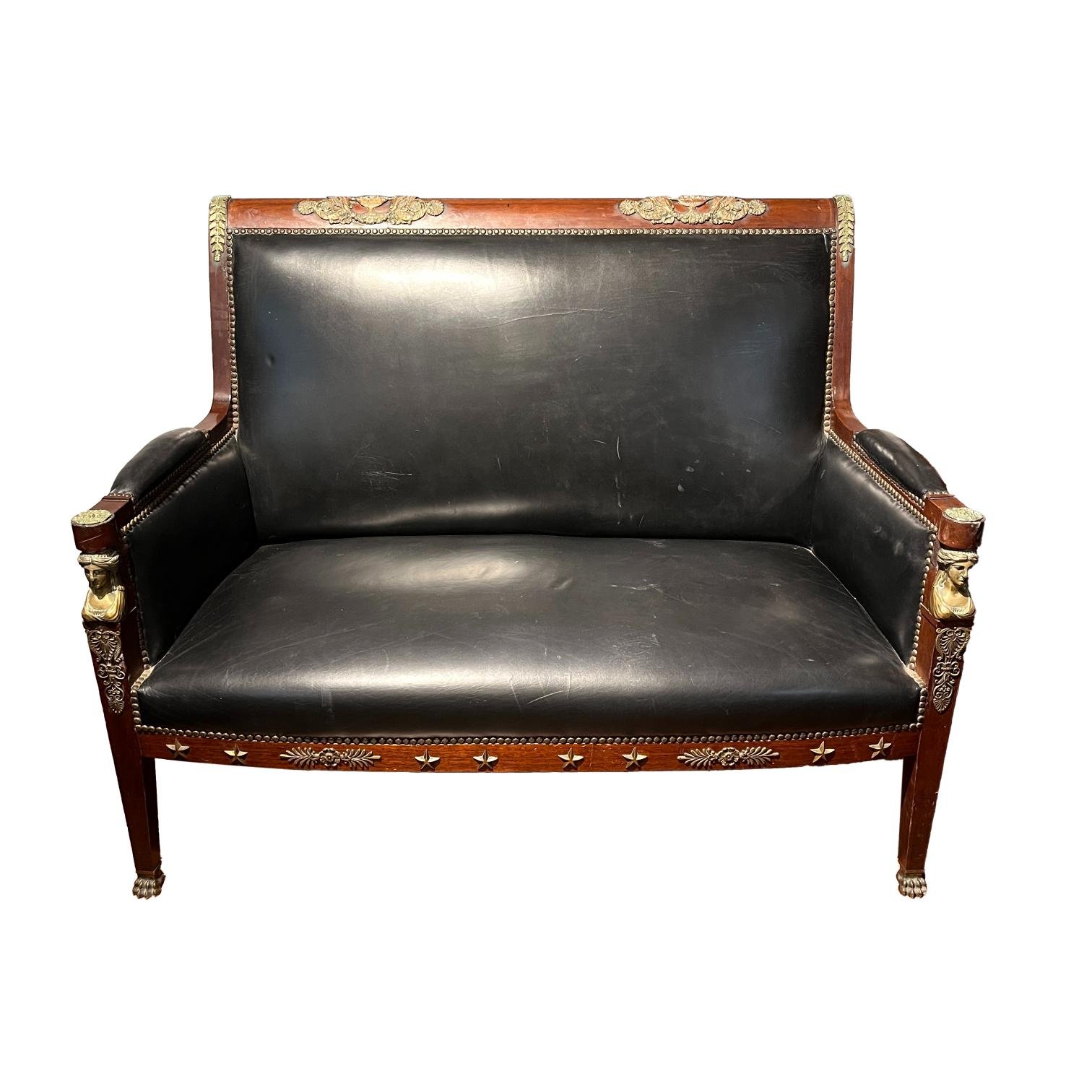Juego de sala estilo Imperio en caoba con monturas en bronce y cobre cincelado «guirnaldas» y decorado «esfinges». Con asientos, respaldos y apoyabrazos tapizados en cuero negro. Compuesto por sofá de dos cuerpos y cuatro sillones individuales. Presenta tiros de polillas.