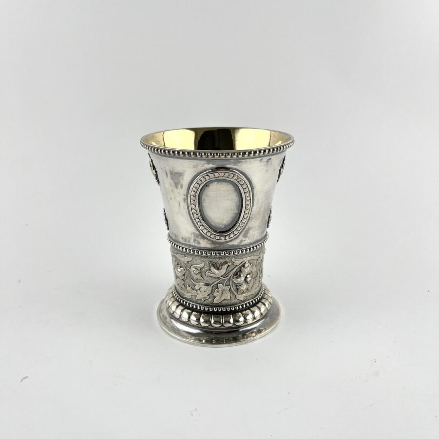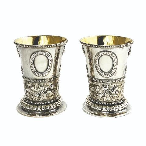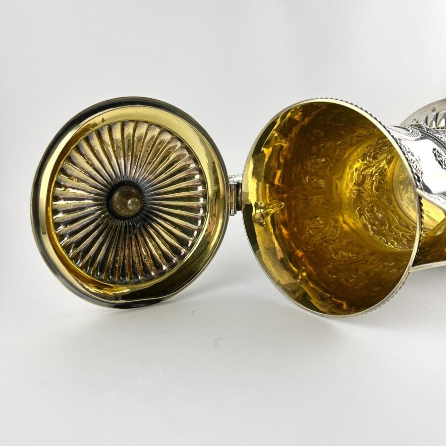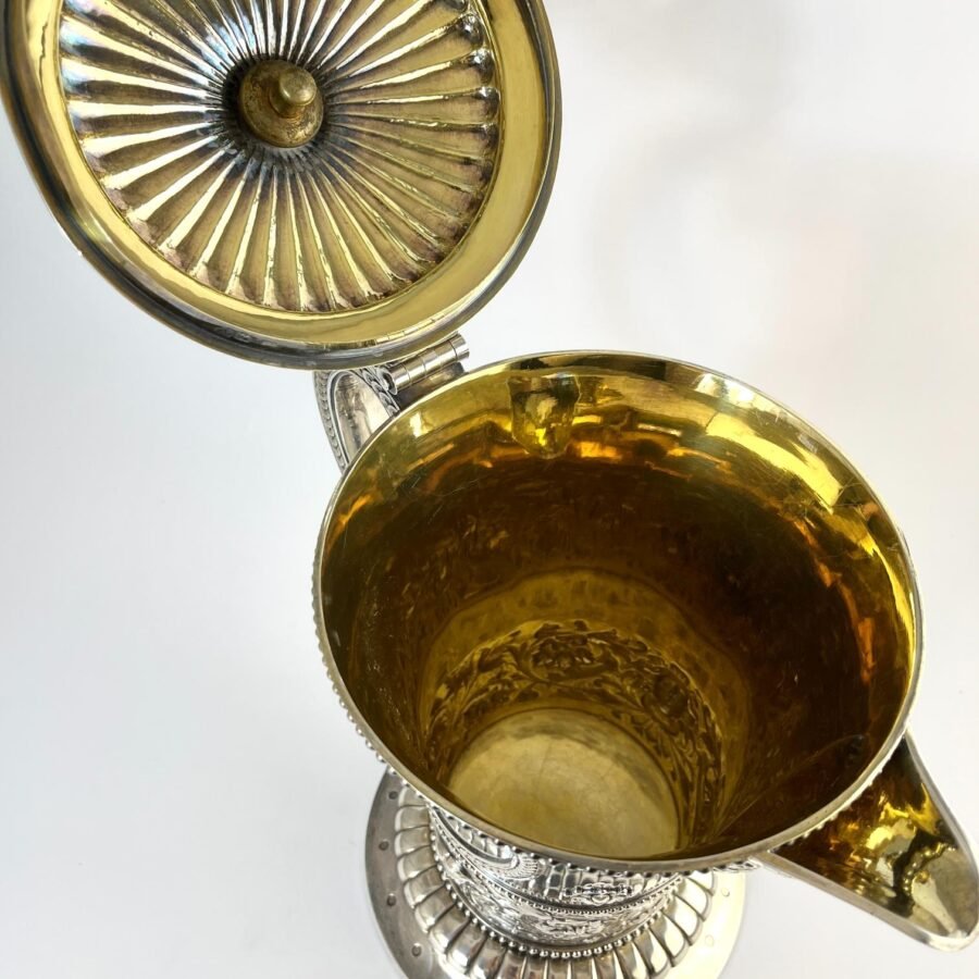 Juego inglés de jarra y par de vasos en plata de Londres año 1876 cincelada «caras, hojas y flores», con interior vermeil y punzón del platero Robert Hennell. Alto jarra 33 cm. Alto vasos 12 cm. Peso total 2.400 gr.