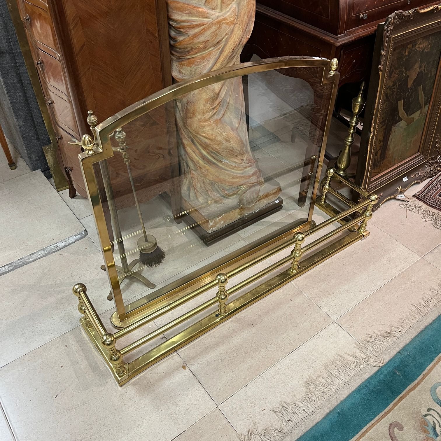 Juego para estufa, en bronce, compuesto por baranda (20 x 105 x 27), con piso (130 x 43 cm); paravant en cristal templado, con marco en bronce (72 x 80); par de morillos y soporte para cuatro herramientas, con una escobilla (alto 65 cm).