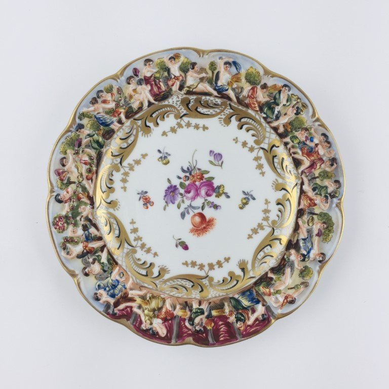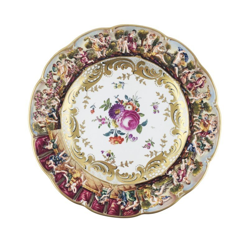 Juego para lunch en porcelana Capodimonte decorada «niños y flores», con detalles en oro y borde en ondas. Compuesto por quince platos y un plato para masas.