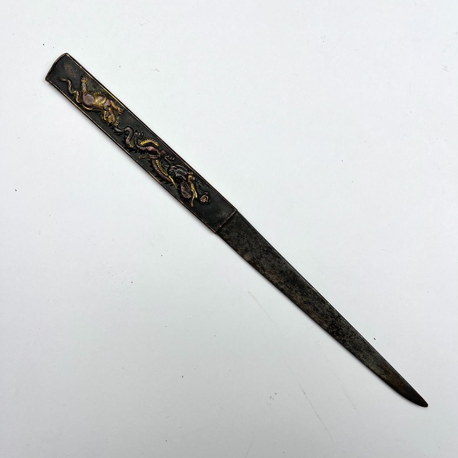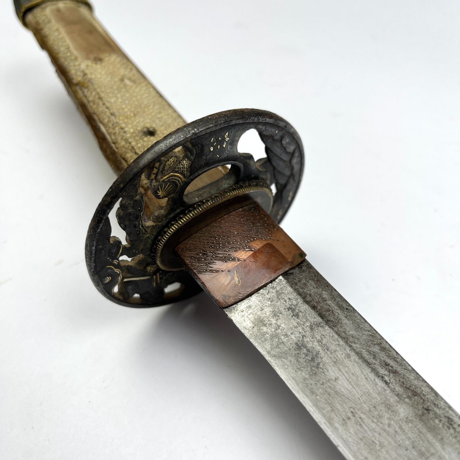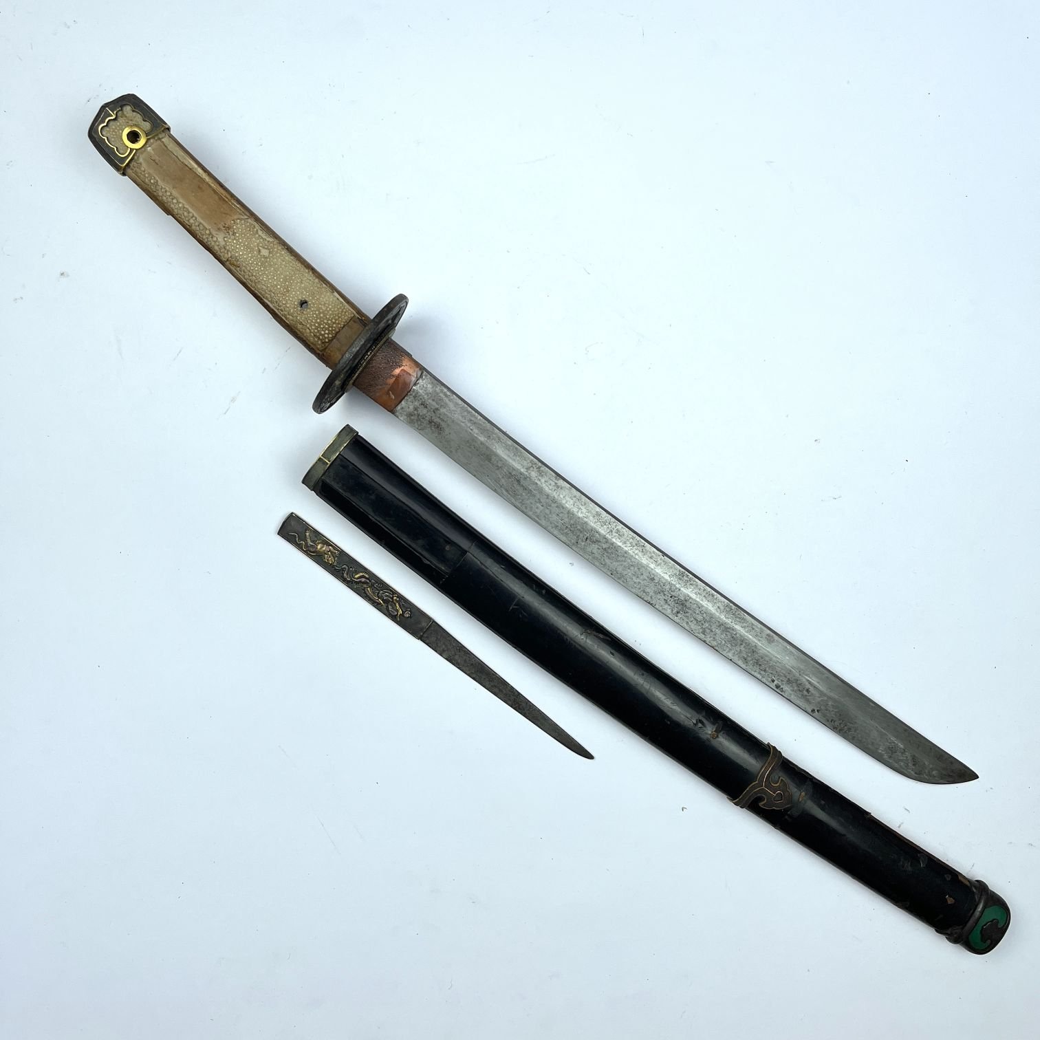 Katana japonesa. Cabo forrado en piel de raya, con faltantes. Tsuba en hierro forjado, calado y cincelado «paisaje con guerreros», con incrustaciones en oro. Vaina en madera laqueada color negro. Miniatura con cabo en bronce pavonado y dorado, decorado «dragones». Largo total 60.5 cm.