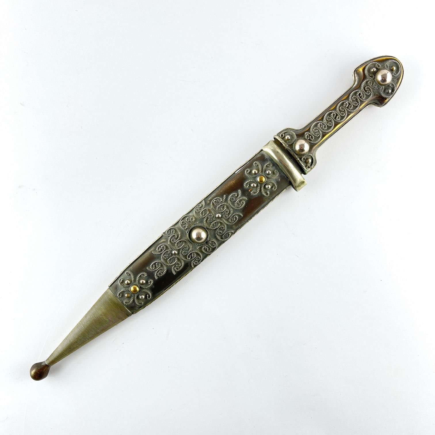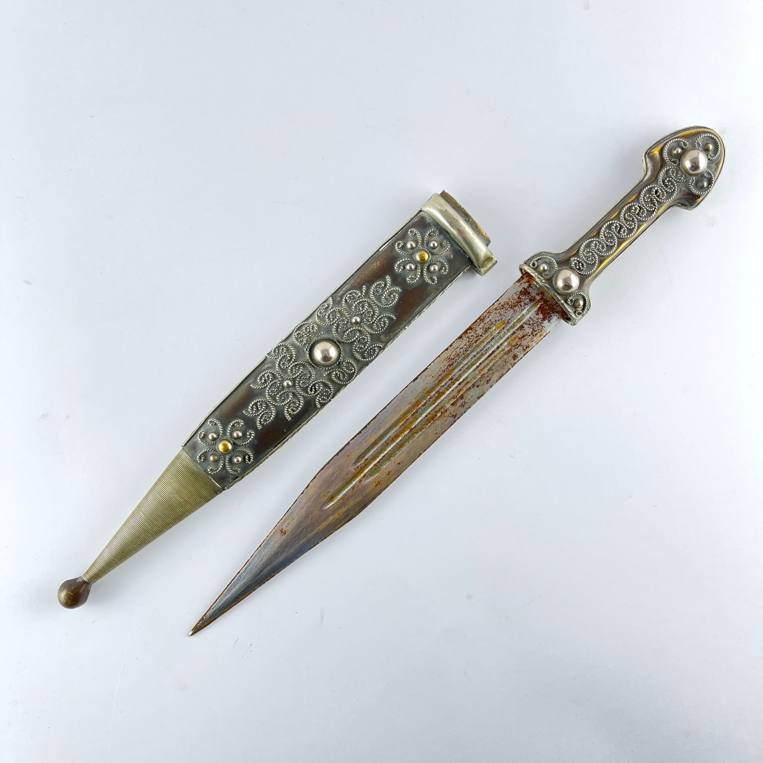 Kinjal. Cabo y vaina en bronce y alpaca decoradas «arabesescos» en filigrana. Largo total 36 cm.