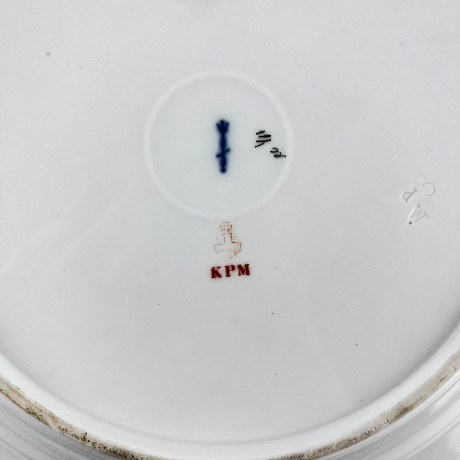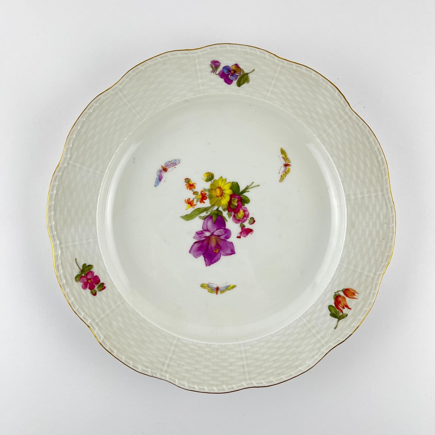 Juego alemán de 12 platos en porcelana KPM pintados a mano “flores e insectos” con borde en ondas y detalle en oro. Diámetro 25 cm.