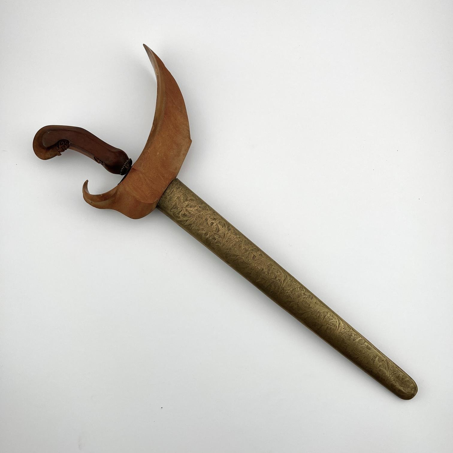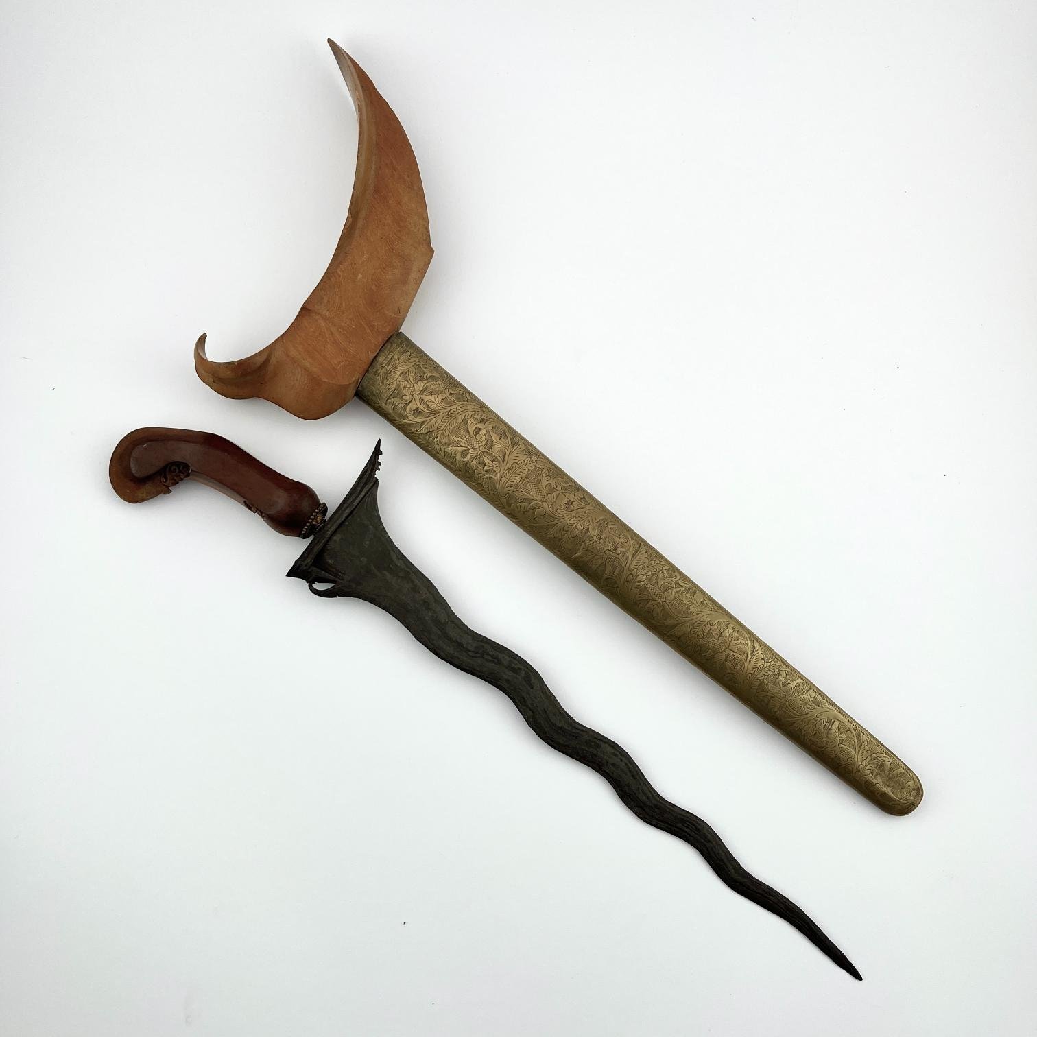 Kris malayo. Hoja damasquinada, flamígera. Cabo en madera tallado. Vaina en bronce cincelada “hojas y flores”. Bocavaina en madera. Largo total 49 cm.