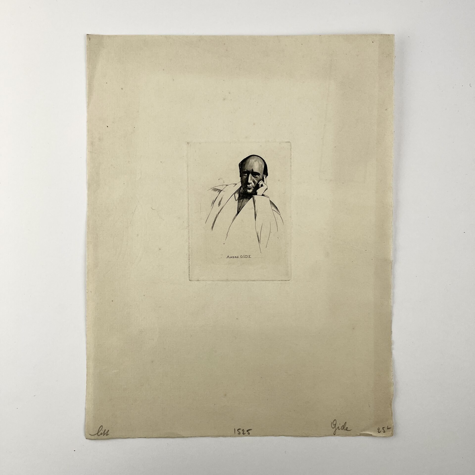 André Gide (1869 – 1951), literato francés, premio Nobel en 1947, aparece en este retrato con una típica pose que lo muestra sentado, con una leve inclinación del cuerpo y apoyando la cabeza sobre su mano izquierda. Numerosos autores se inspiraron en su obra; entre ellos Luis Cernudas, Albert Camus y Jean-Paul Sastre. El retrato fue realizado por el artista francés Ladislas Loevy.