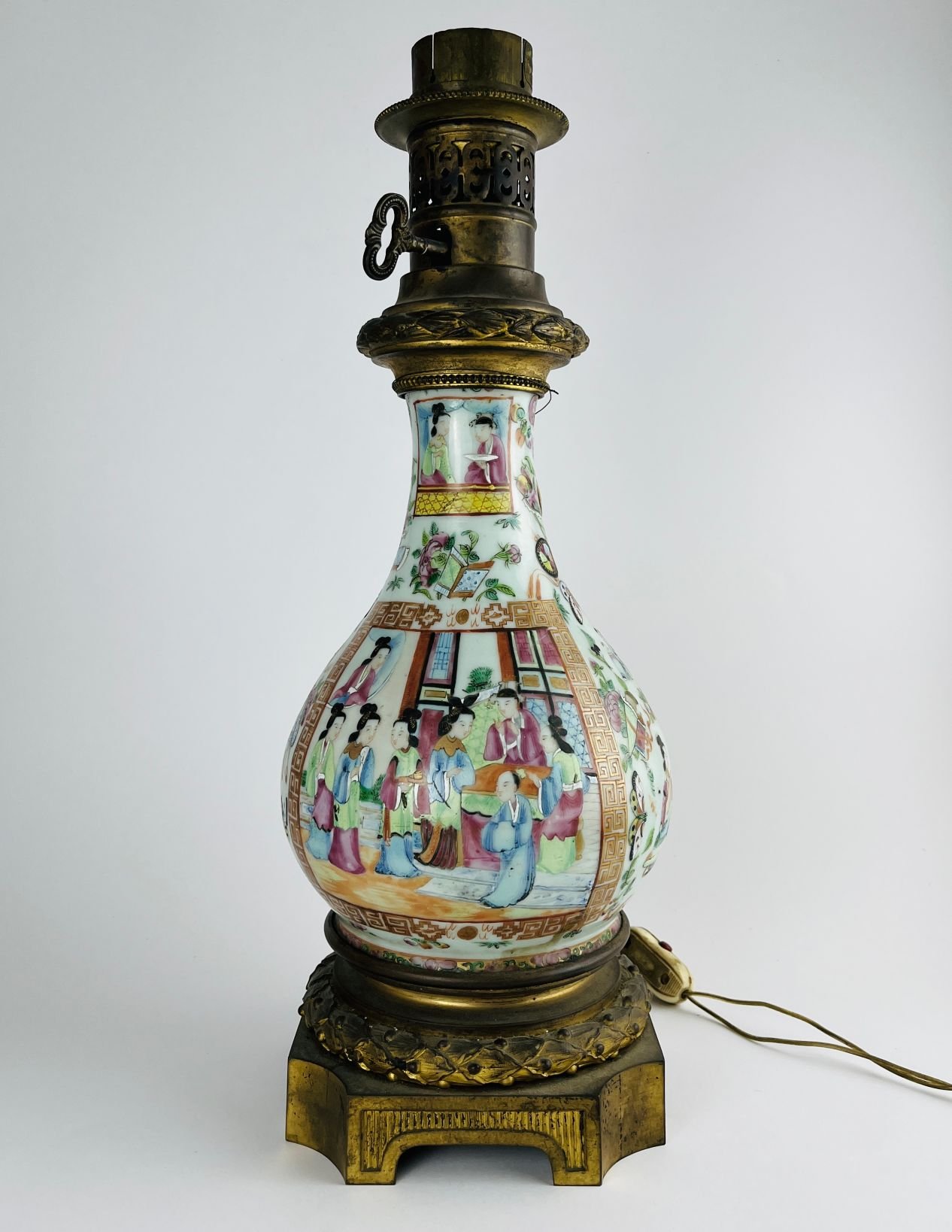 Lámpara china de sobremesa, una luz, en porcelana Cantón decorada «damas, flores y mariposas». Montura y base en bronce cincelado. Alto 44 cm.