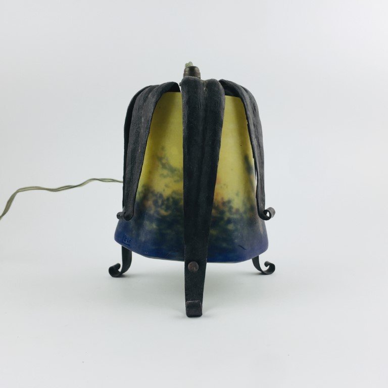 Lámpara de sobremesa en hierro forjado pátina oscura. Pantalla en cristal color amarillo, azul y anaranjado. Firmada L’Elf. 17 x 13 cm.