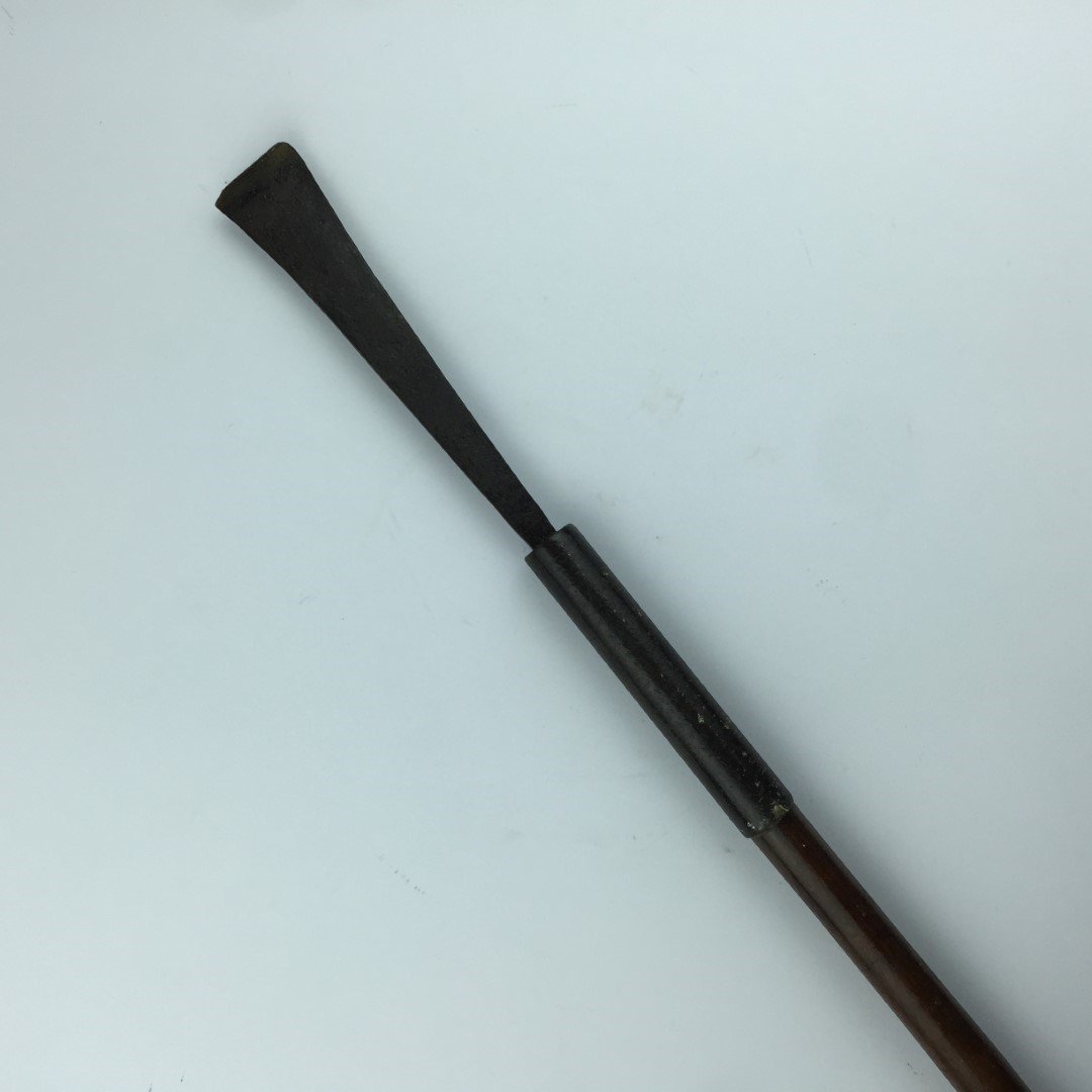 Lanza africana con punta tipo palma en hierro forjado. Regatón tipo gancho. Asta en madera. Largo total 141 cm.