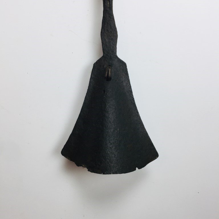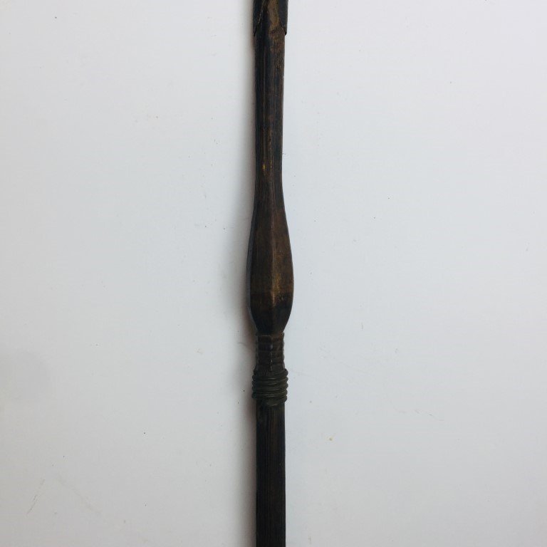 Antigua lanza congolense en madera tallada. Punta en forma de palma y base con campana para cencerro de animales heridos, ambas en hierro forjado. Alto 155 cm.