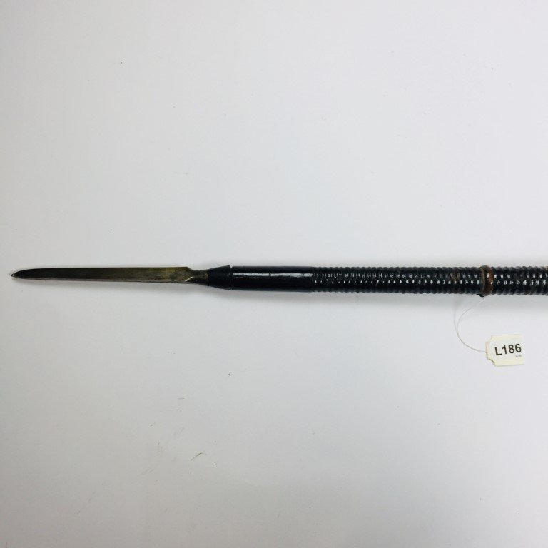 Lanza yari japonesa en madera. Hoja de tres caras, virola y regatón en metal pintado color negro y grip con cordón laqueado color negro y bordeaux. Largo 212 cm.