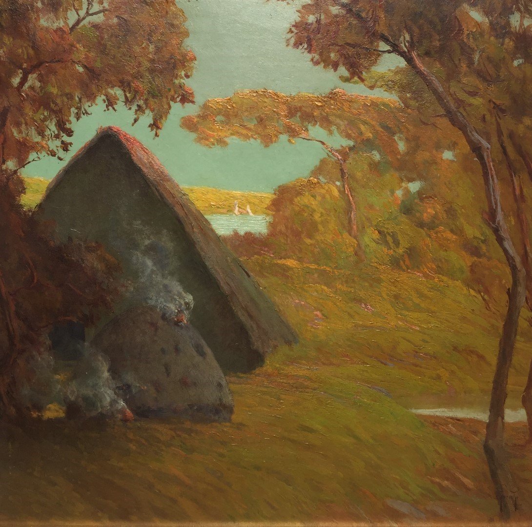 LAROCHE, Ernesto (escuela uruguaya, 1879-1940). Óleo sobre tela. «Paisaje de campo.» Firmado abajo a la derecha. Al dorso vuelto a firmar. 43 x 44 cm