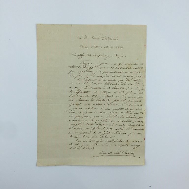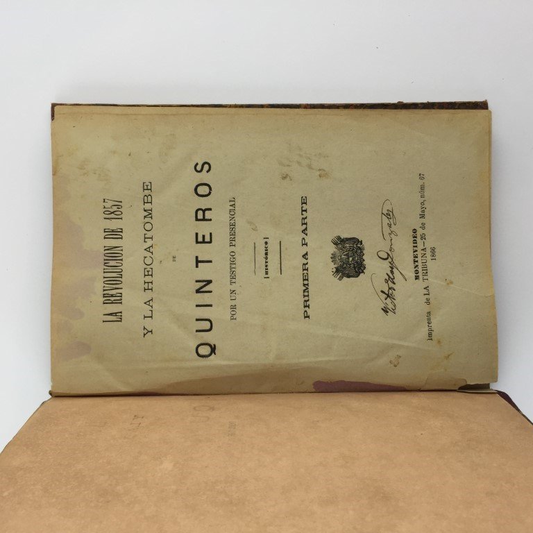 “La revolución de 1857 y la Hecatombe de Quinteros, por un testigo presencial. Primera parte.” Imprenta de La Tribuna. Montevideo, 1866. Un tomo. 310 p. Acompañado de carta manuscrita firmada por Juan M. de la Sierra, fechada en la Unión en octubre de 1866 y dirigida a Tomás Alberdi, donde de la Sierra, autor del libro, confirma que su mención en él acerca de «dos ayudantes que no volvieron a dar cuenta» tras el ataque de enero 1958 no hacía referencia a la persona de Alberdi. 1 folio.