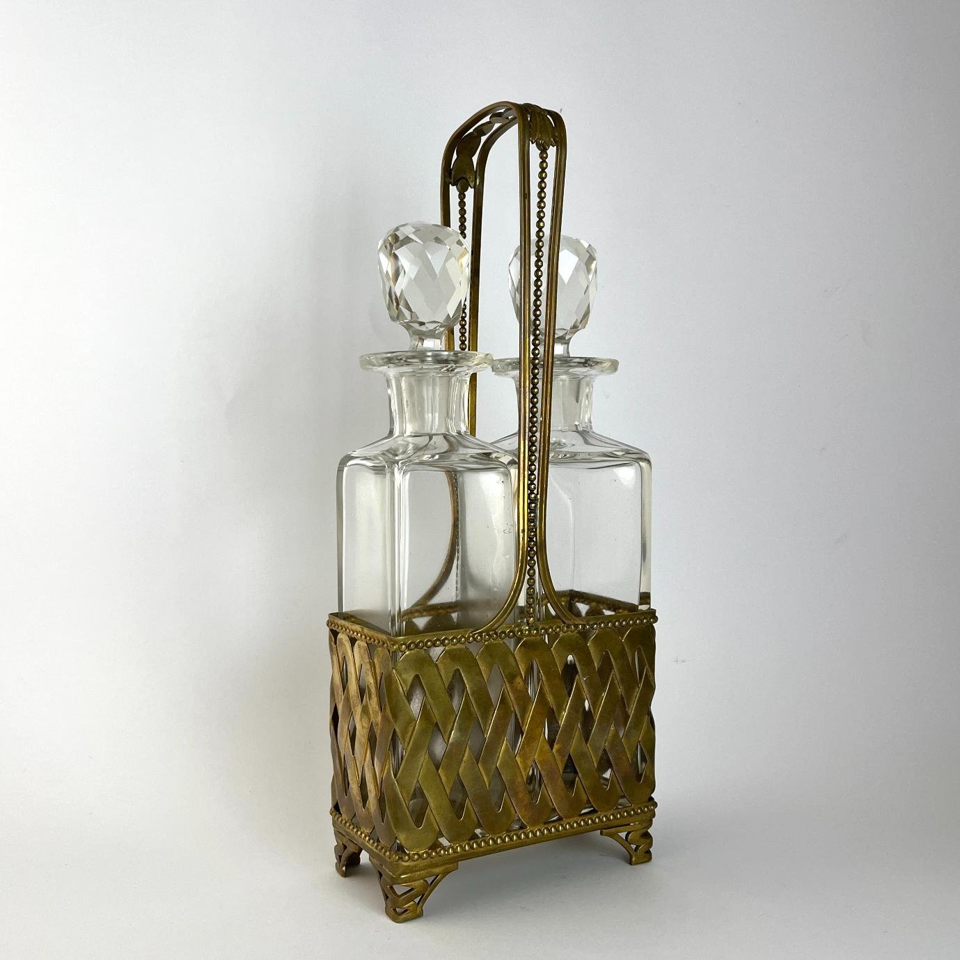 Licorera francesa en bronce calado y dorado al mercurio, con dos botellones cuadrados en cristal tallado. Alto total 34 cm. Uno de los botellones con cascadura.