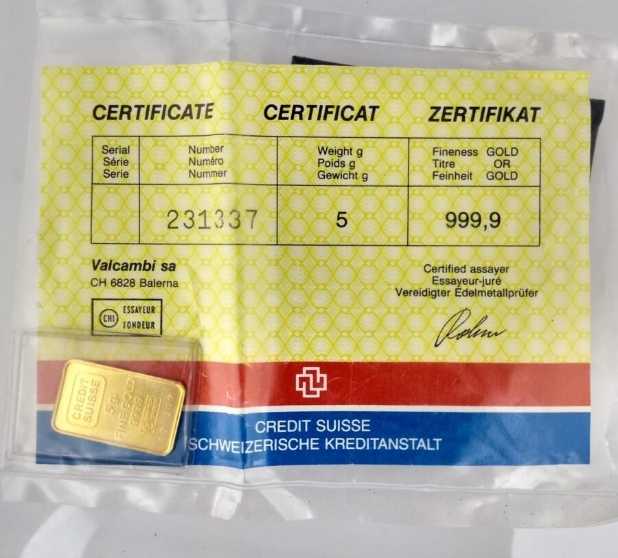Lingote en oro del Credit Swiss. Peso 5 gr. Certificado y numerado 231337.