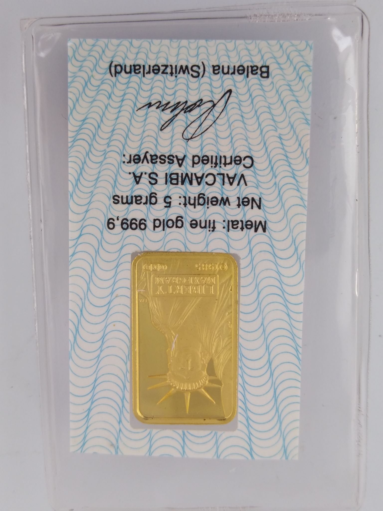 Lingote en oro del Credit Swiss. Peso 5 gr. Certificado y numerado 020974.
