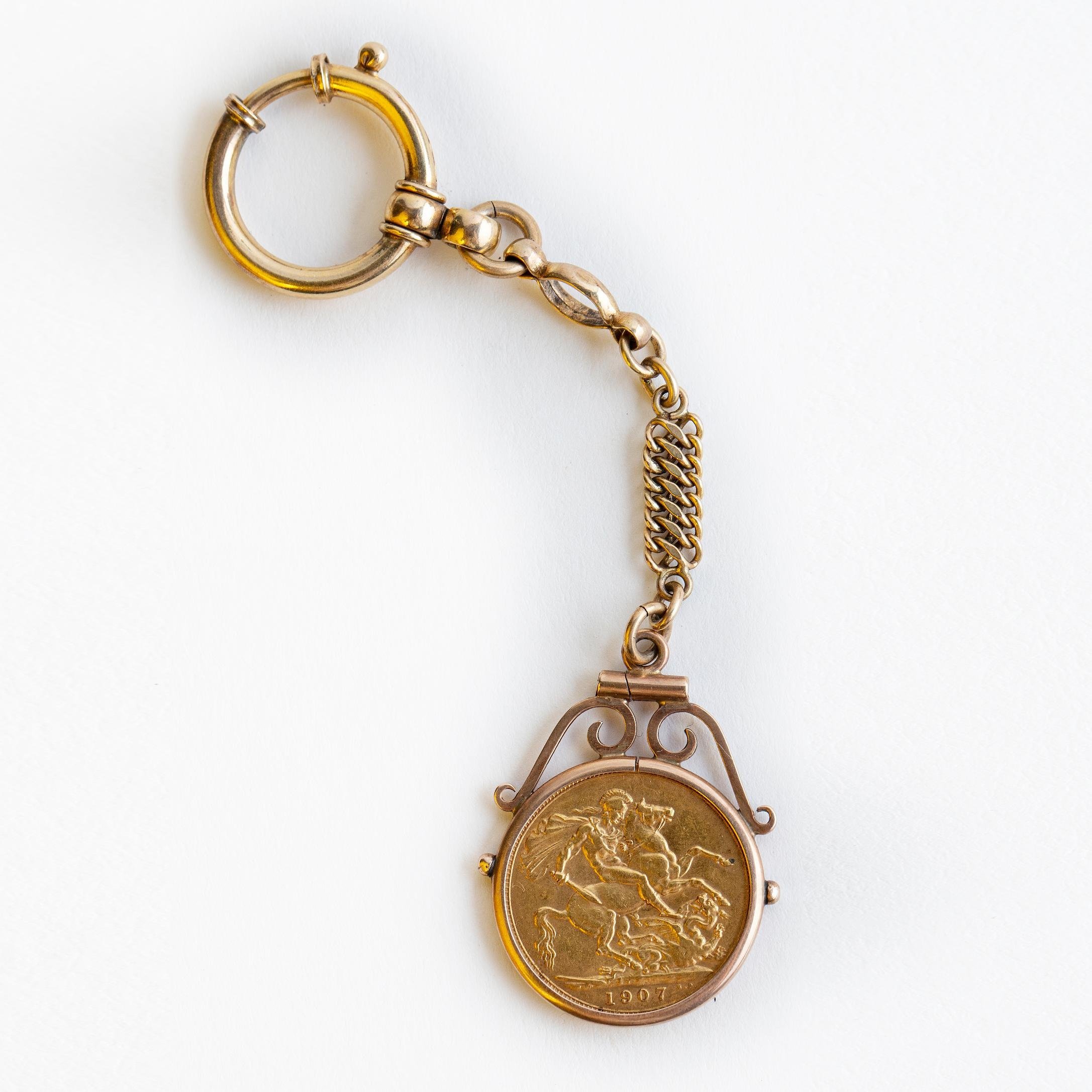 Llavero en oro 18 K amarillo con moneda británica en oro denominación una libra del año 1907. Peso bruto 14.6 gr.