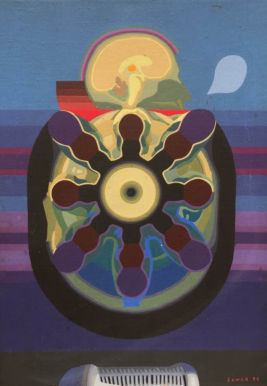 LONGA, Hugo (escuela uruguaya, 1934-1990). Acrílico sobre tela. «El holandés errante. (¿Convertido en mohicano?) ¿El último? Sí.» Firmado y fechado «74» abajo a la derecha. Al dorso fechado, medido, titulado y vuelto a firmar. 33 x 24 cm.