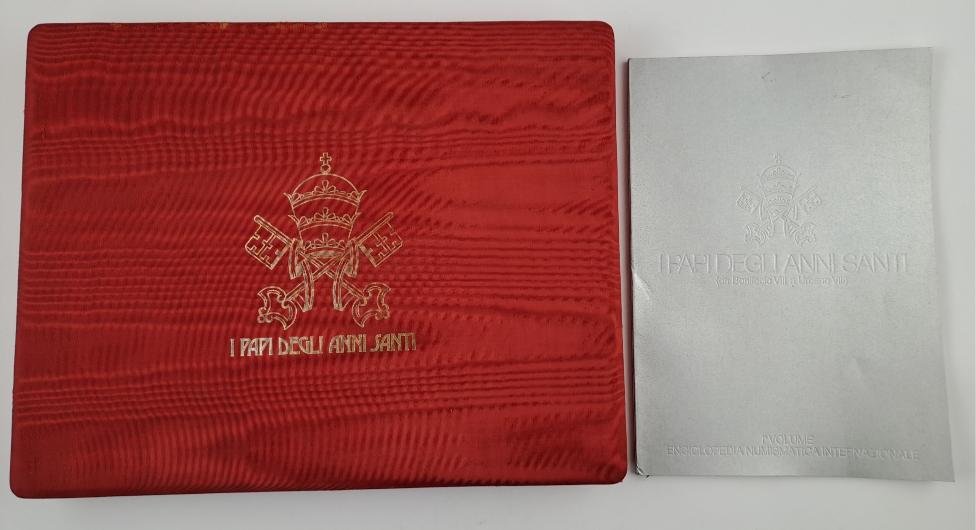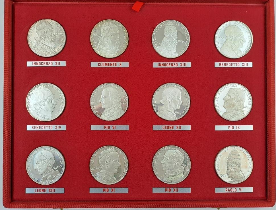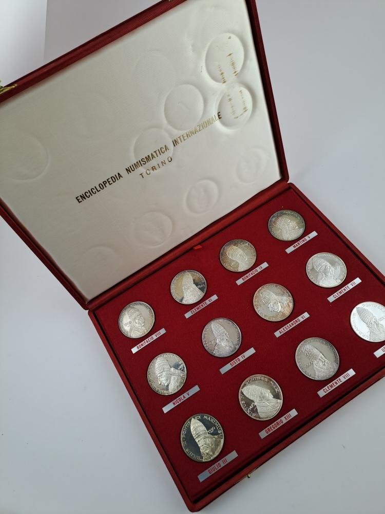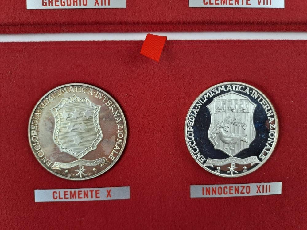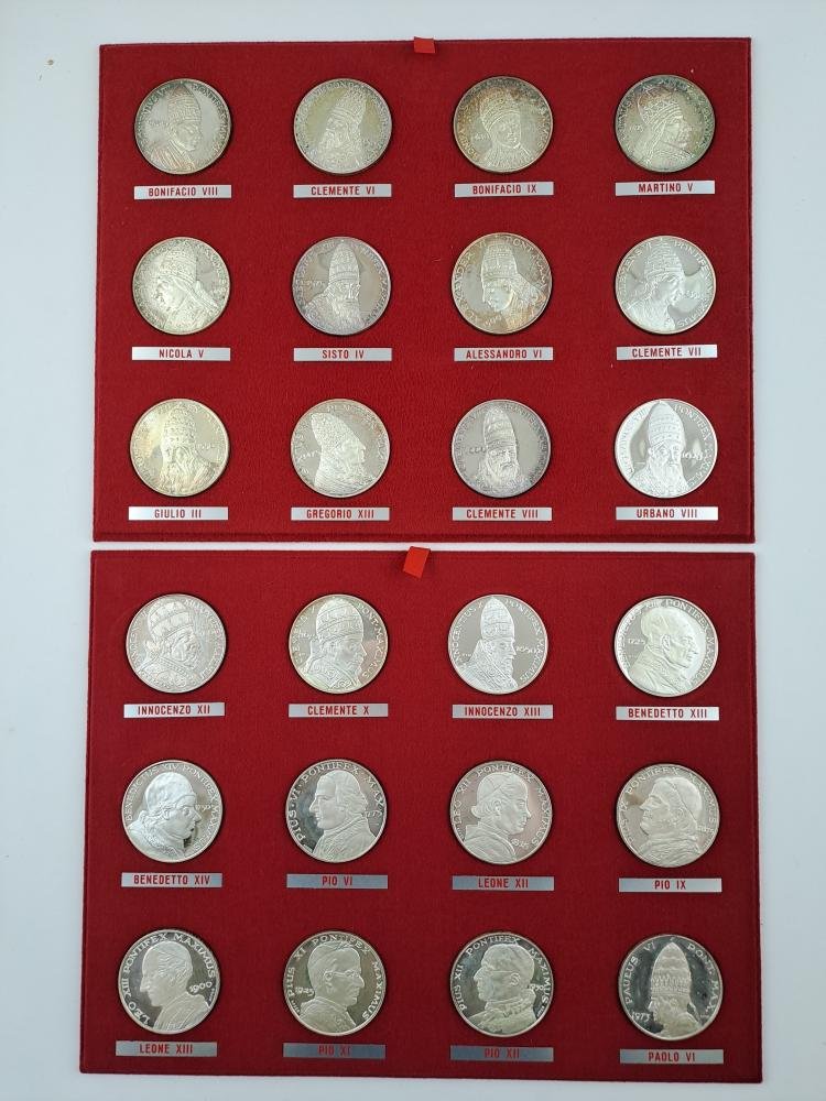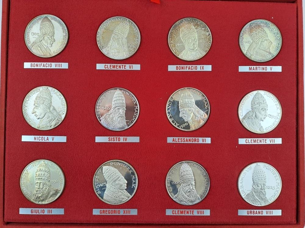 Set de veinticuatro medallas en plata 925. “I Papi Degli Anni Santi”, de Bonifacio VIII a Urbano VIII. En estuche orignal, acompañado por volumen “1” con inscripción “No 0241”. Peso promedio de cada una 35,25 gr. Acuñado por Enciclopedia numismática internacional de Turín, año 1975.