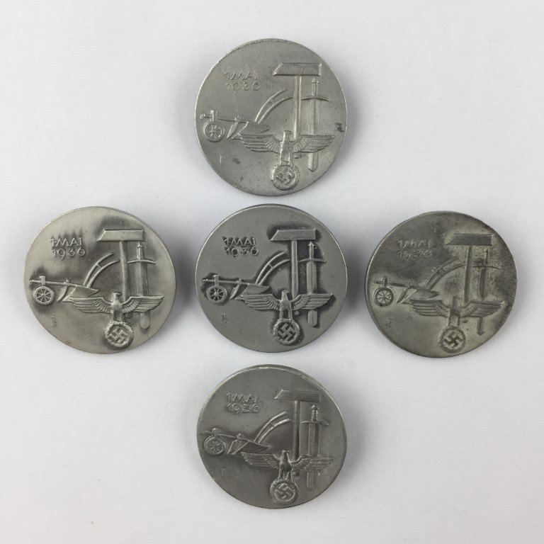 Lote de cinco pins alemanes en aluminio, conmemorativos del día del trabajador, 1936. Período nacionalsocialista. Diferentes fabricantes.