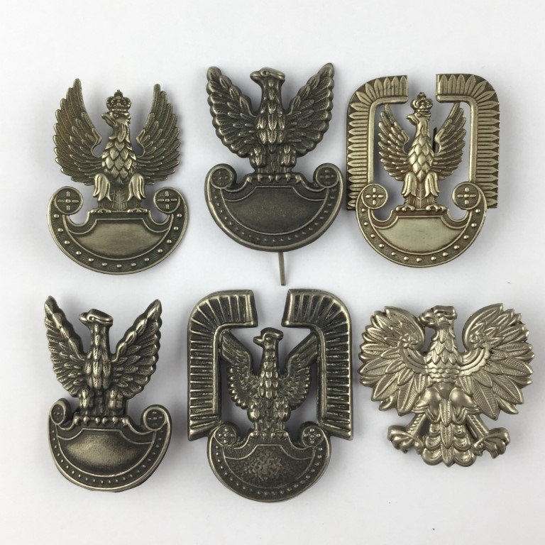 Lote de seis insignias de gorra polaca en metal estampado. Período WWII.