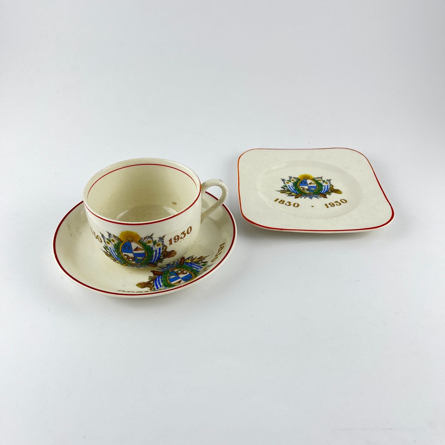 Tres piezas en loza inglesa pertenecientes al juego de té uruguayo conmemorativo del Centenario de 1930: una taza con su platillo y un platillo cuadrado.
