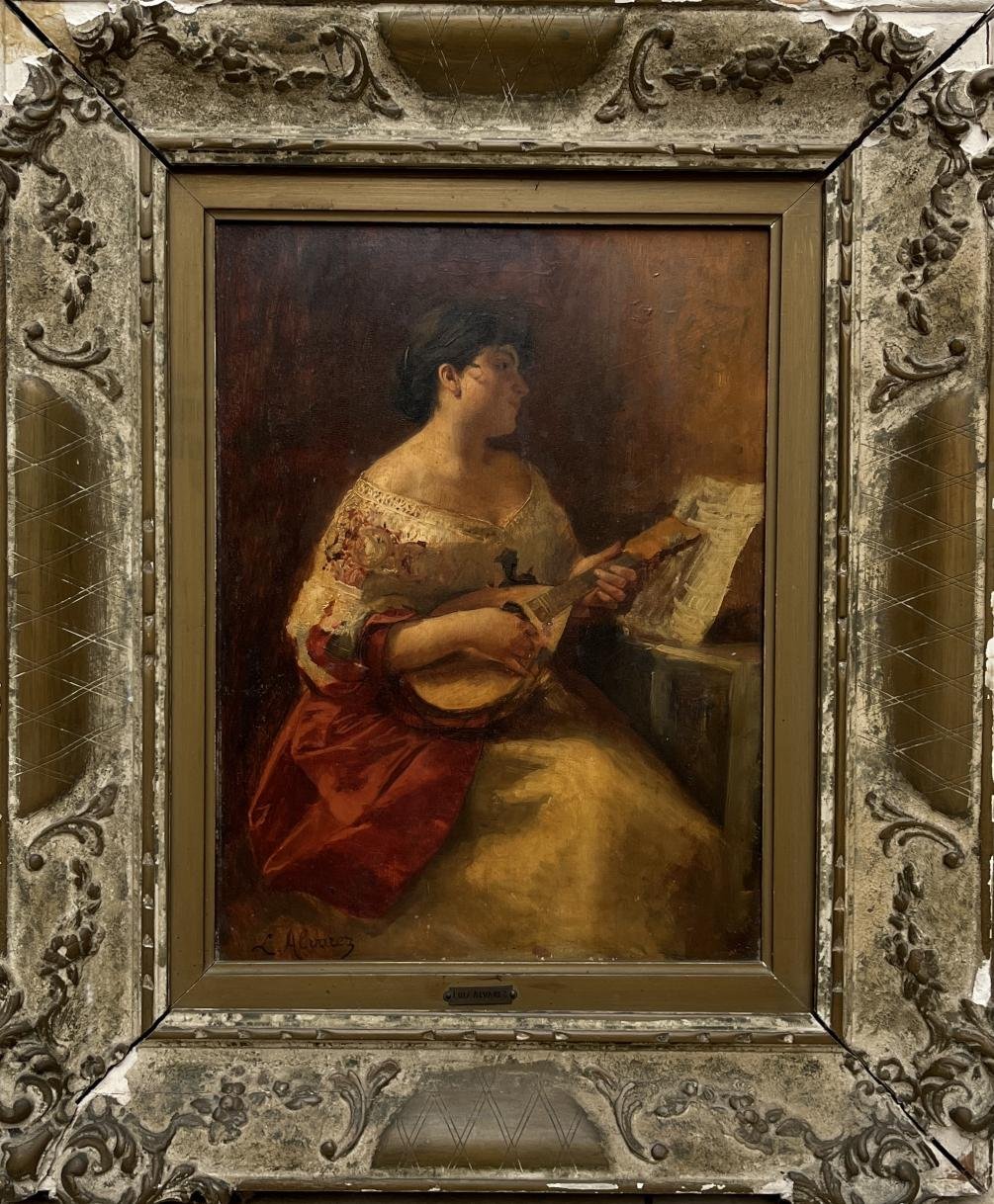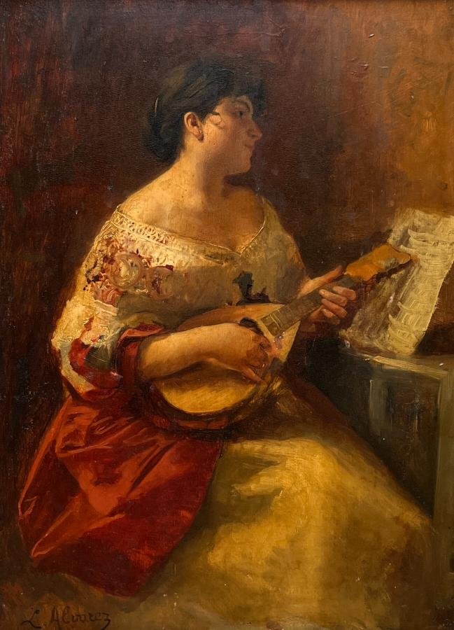 LUIS ÁLVAREZ CATALÁ (Escuela española, 1836-1901) «La laudista» Óleo sobre madera Firmado abajo a la izquierda 41 x 30 cm