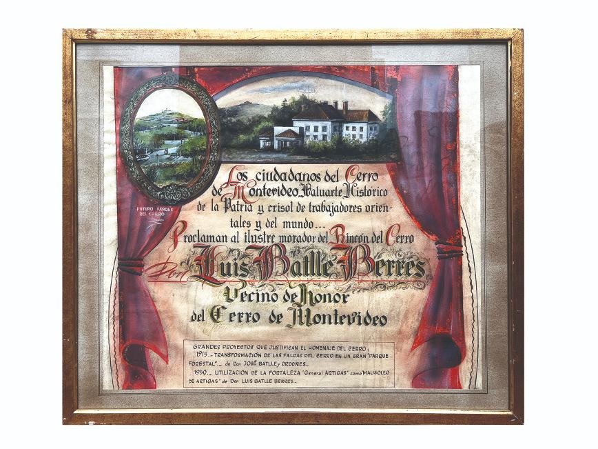 Témpera sobre papel. “Vista de la residencia de Luis Batlle Berres en Rincón del Cerro”, con inscripción “Los ciudadanos de Cerro de Montevideo, baluarte histórico de la patria y crisol de trabajadores orientales y del mundo proclaman al ilustre morador del Rincón del Cerro, Don Luis Batlle Berres, vecino de honor del Cerro de Montevideo”. C. 1953. 55 x 63 cm. Enmarcado.