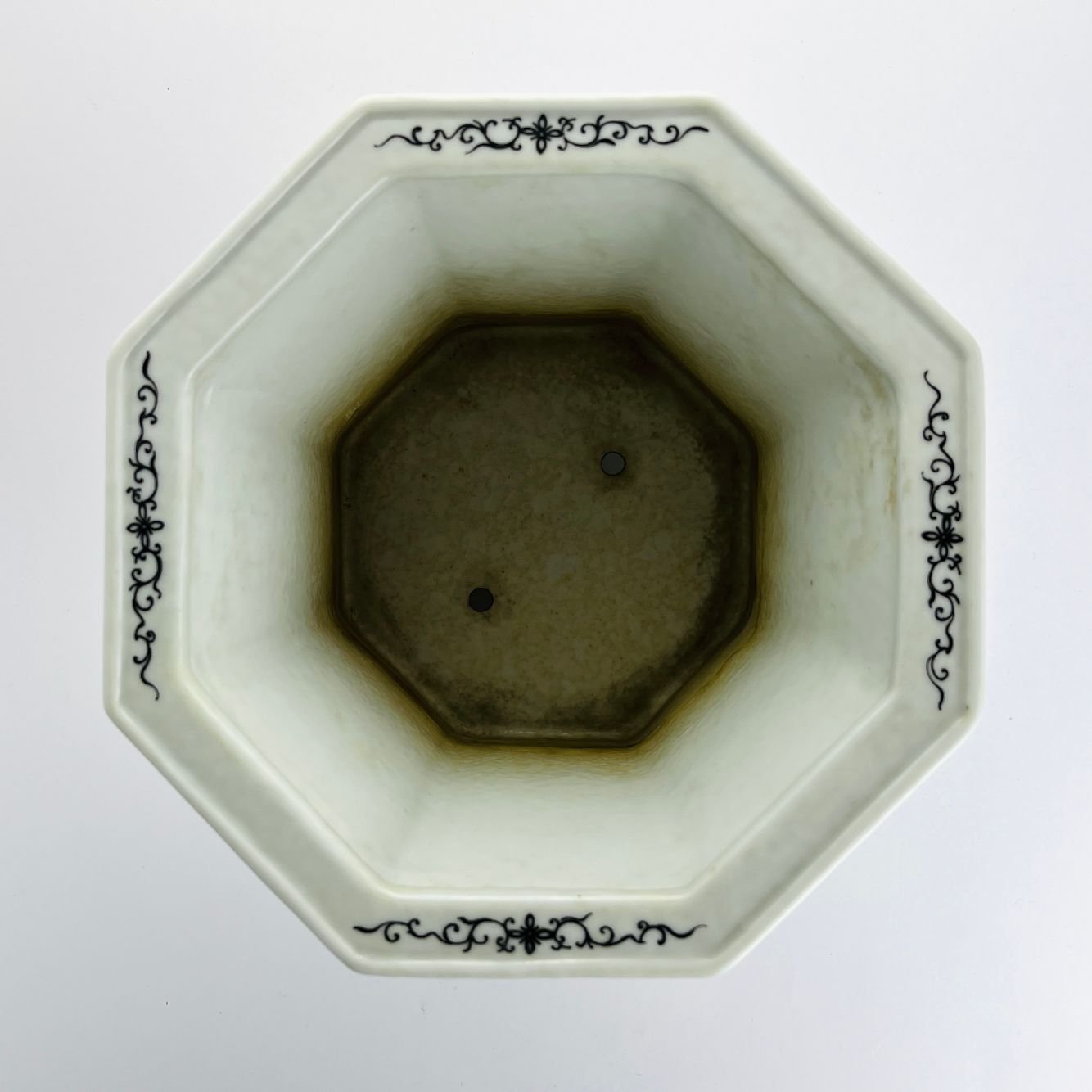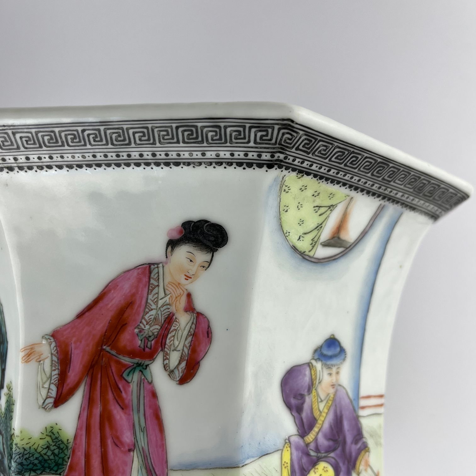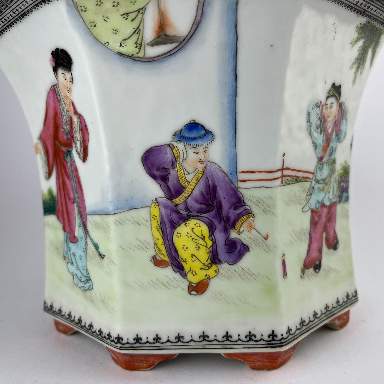 Macetero chino hexagonal en porcelana Familia Rosa. 14 x 21 cm.