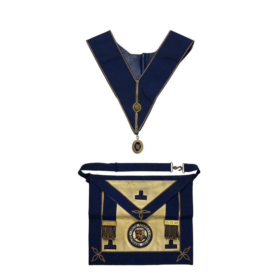 Conjunto de mandil, collarín y joya masónicos de la logia South America Southern Division. Joya en bronce dorado.