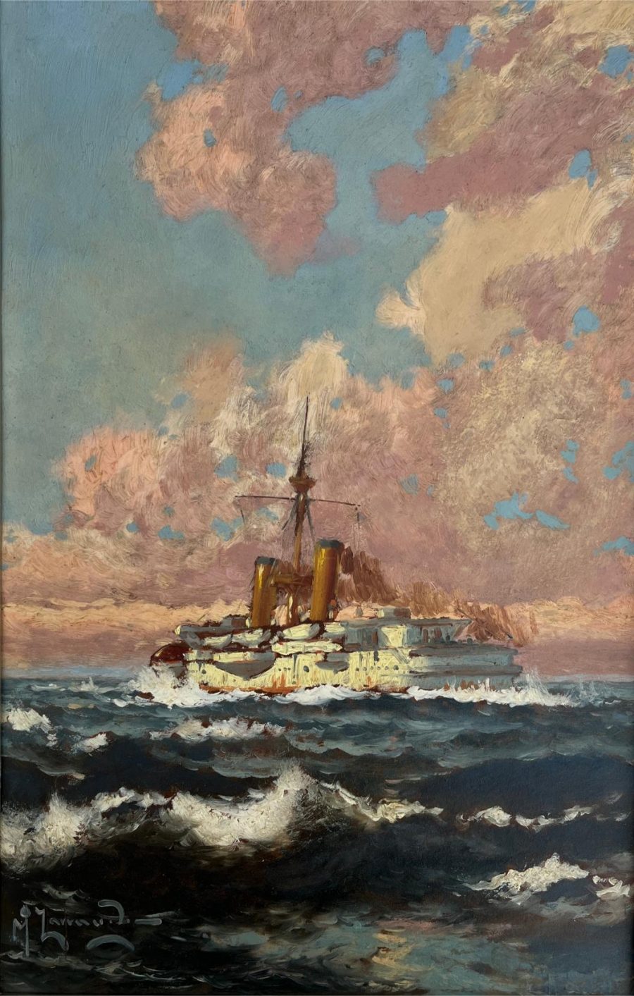MANUEL LARRAVIDE (Escuela uruguaya, 1871-1910) Óleo sobre fibra «Buque a vapor» Firmado abajo a la izquierda 37 x 23.5 cm