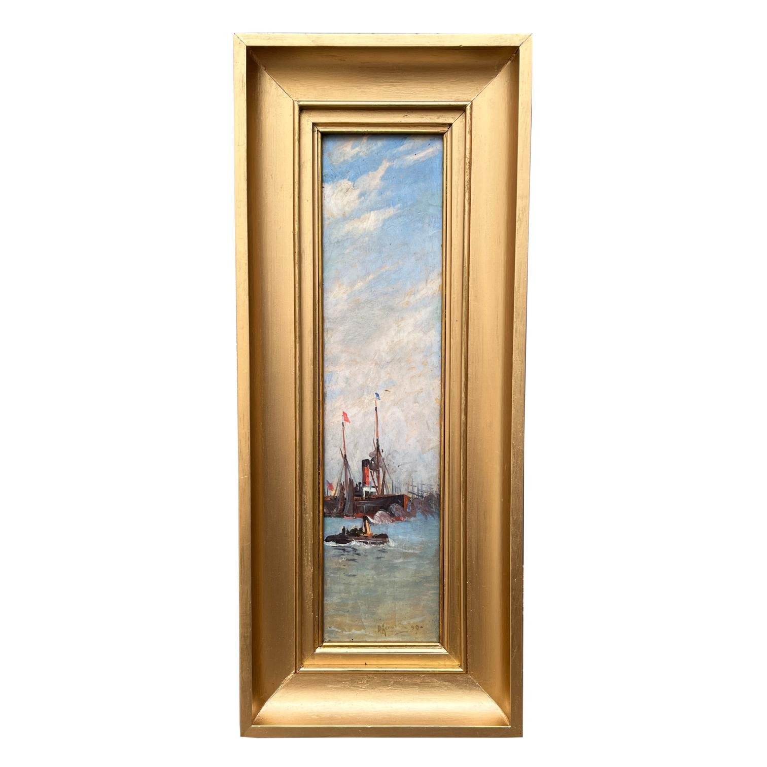 MANUEL LARRAVIDE (escuela uruguaya, 1871-1910). Par de óleos sobre fibra. «Marinas.» 48 x 11 cm.