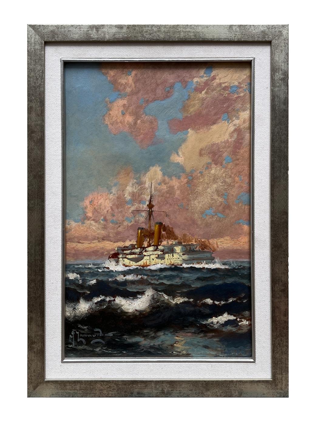 MANUEL LARRAVIDE (escuela uruguaya, 1831-1910). Óleo sobre cartón. «Marina.» Firmado abajo a la izquierda. 38 x 24 cm.