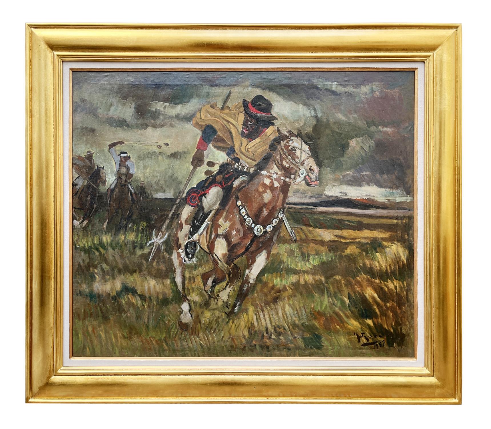 MANUEL ROSÉ (escuela uruguaya, 1882-1961). Óleo sobre tela. «Cabalgata gaucha.» Óleo sobre tela. Firmado y fechado «57» abajo a la derecha. 74 x 90 cm.