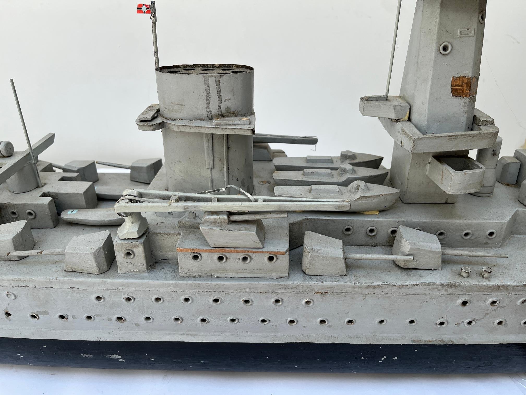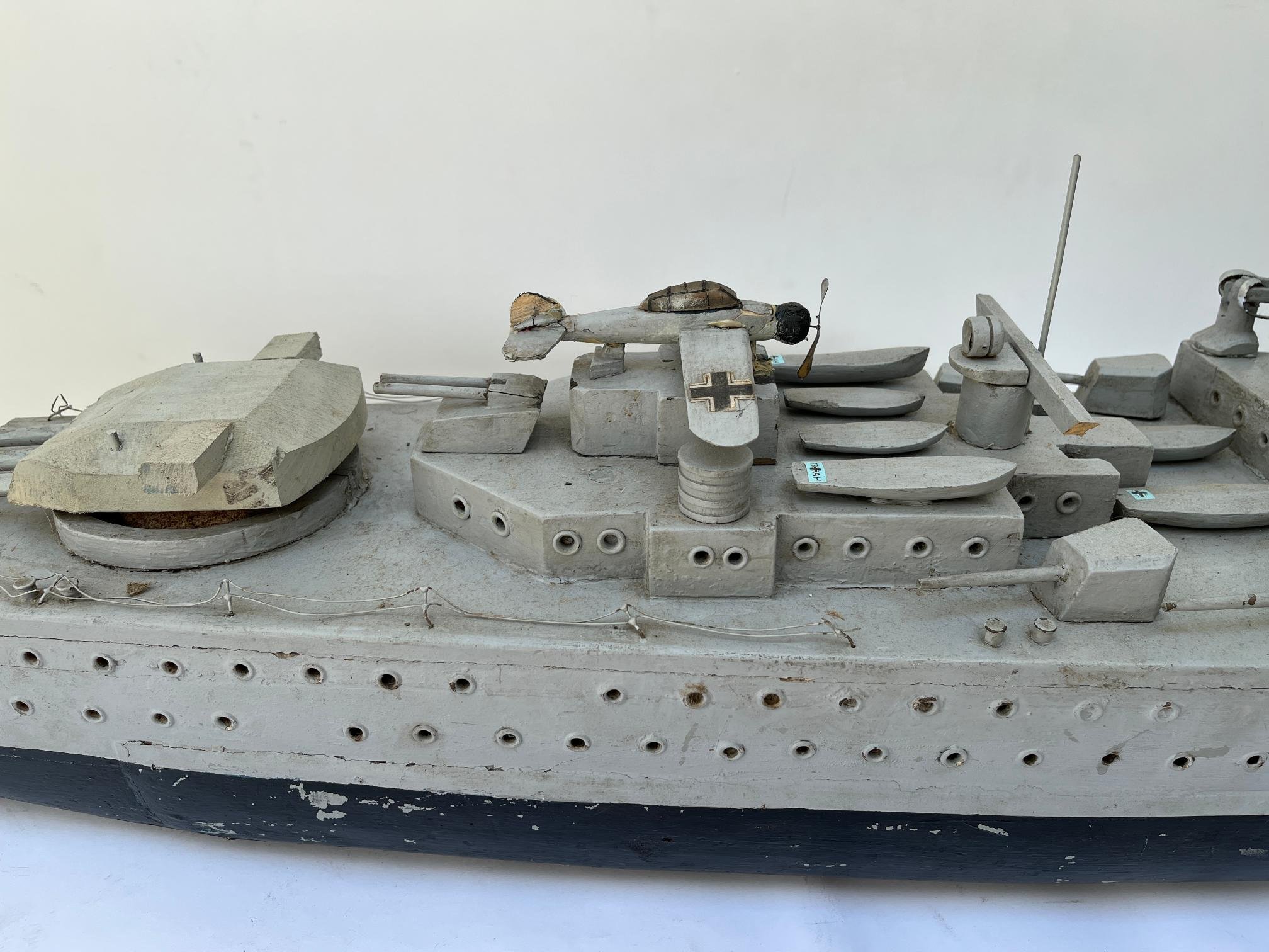 Maqueta del acorazado alemán Admiral Graf Spee, en madera tallada y policromada. 90 x 47 x 20 cm.
