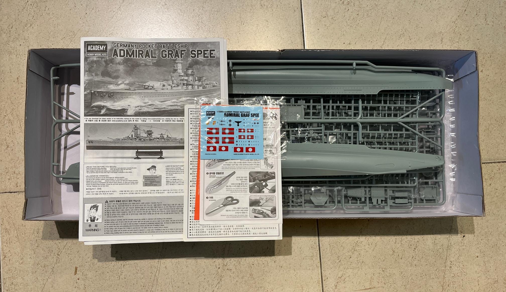 Maqueta para armar, escala 1/350. “Acorazado alemán Admiral Graf Spee.” Marca Academy Hobby Model Kits. Sin uso, en caja original.