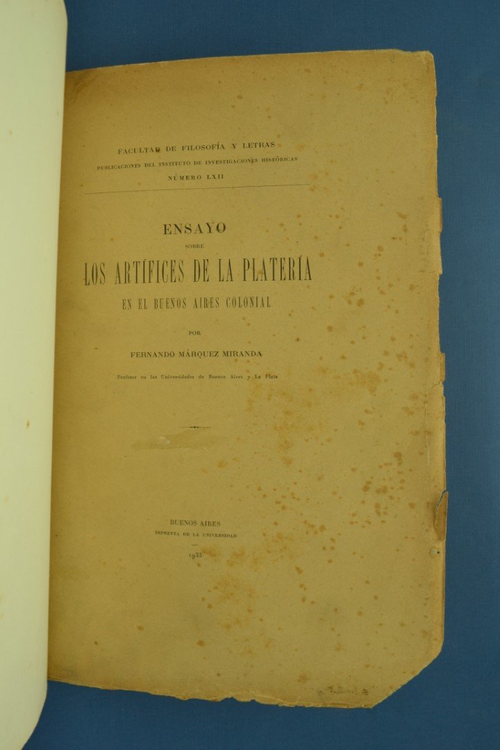 MÁRQUEZ MIRANDA, Fernando: Ensayo sobre los Artífices de la Platería en el Buenos Aires Colonial. Buenos Aires, Imprenta de la Universidad. 1933. Ejemplar No. 916