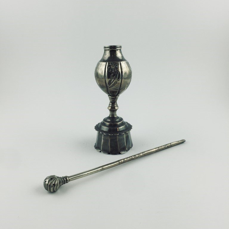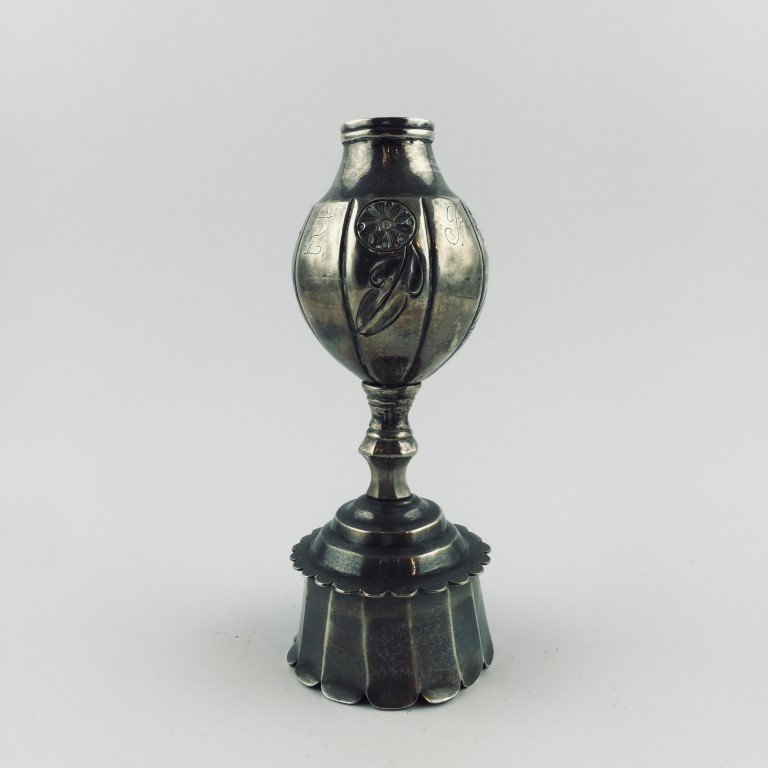 Mate siglo XIX tipo cáliz, en plata lobulada y cincelada «hojas y flores» e iniciales «L.Z.P.», con base redonda facetada. Alto 16 cm. Con bombilla en plata con secciones gallonadas, con coco en forma de fruto. Alto bombilla 25 cm. Ex colección Prof. Schulkin.