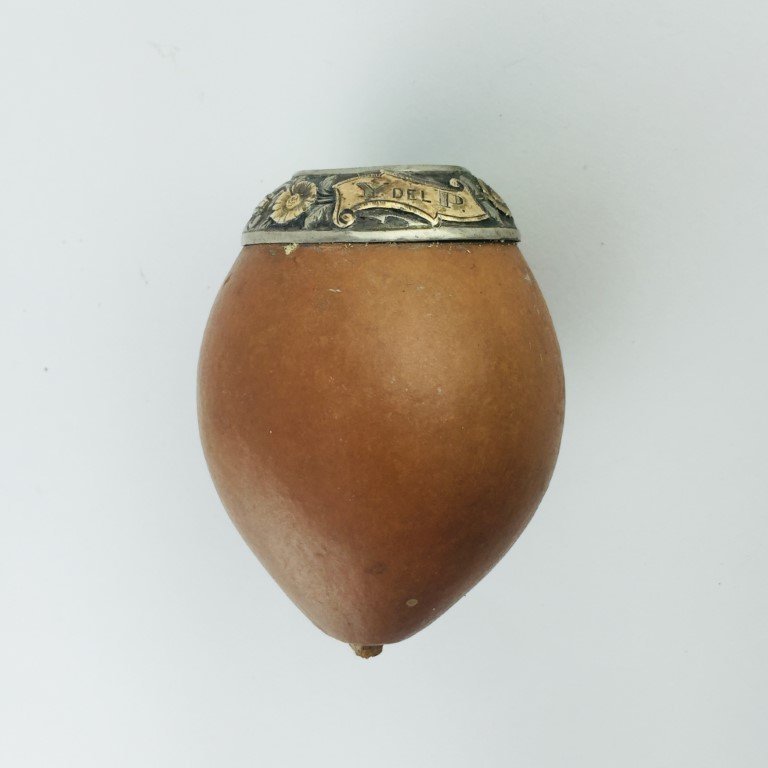 Mate para niño en calabaza marrón con virola en plata y oro cincelados «hojas y flores», con dos cartelas grabadas con iniciales «A.B.» e «Y. del P.». 9 x 6 cm.