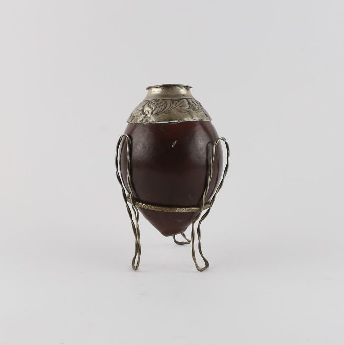 Mate en calabaza marrón con virola en plata cincelada «hojas y flores». Alto 11.6 cm.